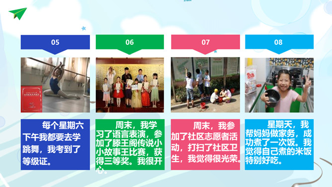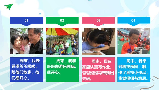 说周末:周末,我去看望爷爷奶奶,陪他们散步,他们很开心。周末,我和哥哥去游乐园玩,很开心。周末,我在家里认真写作业,爸爸妈妈再带我出去玩。周末,我来到科技乐园,制作了科技小作品,我觉得很有意思。每个星期六下午我都要去学跳舞,我考到了等级证。周末,我学习了语言表演,参加了滕王阁传说小小故事王比赛,获得三等奖。我很开心。周末,我参加了社区志愿者活动,打扫了社区卫生,我觉得很光荣。星期天,我帮妈妈做家务,成功煮了一次饭。我觉得自己煮的米饭特别好吃。所属专题:周末巧安排ppt。