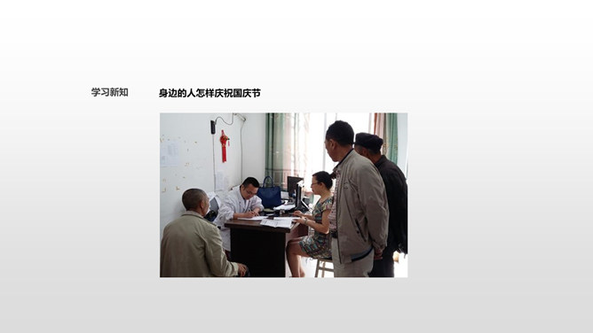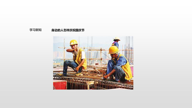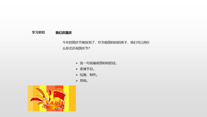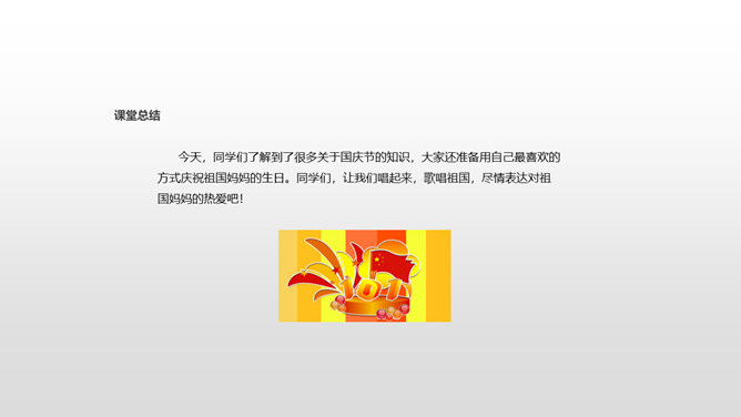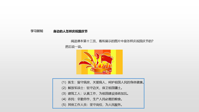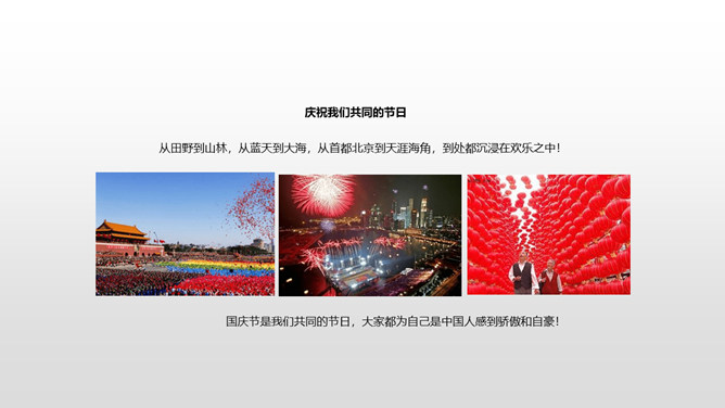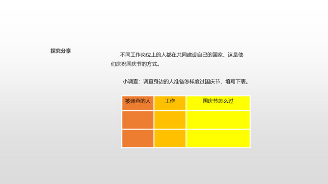 从田野到山林,从蓝天到大海,从首都北京到天涯海角,到处都沉浸在欢乐之中!国庆节是我们共同的节日,大家都为自己是中国人感到骄傲和自豪!不同工作岗位上的人都在共同建设自己的国家,这是他们庆祝国庆节的方式。小调查:调查身边的人准备怎样度过国庆节,填写下表。今年的国庆节就快到了,作为祖国妈妈的孩子,我们可以用什么形式庆祝国庆节?今天,同学们了解到了很多关于国庆节的知识,大家还准备用自己最喜欢的方式庆祝祖国妈妈的生日。同学们,让我们唱起来,歌唱祖国,尽情表达对祖国妈妈的热爱吧!所属专题:欢欢喜喜庆国庆ppt。