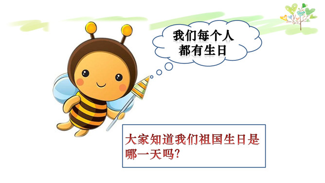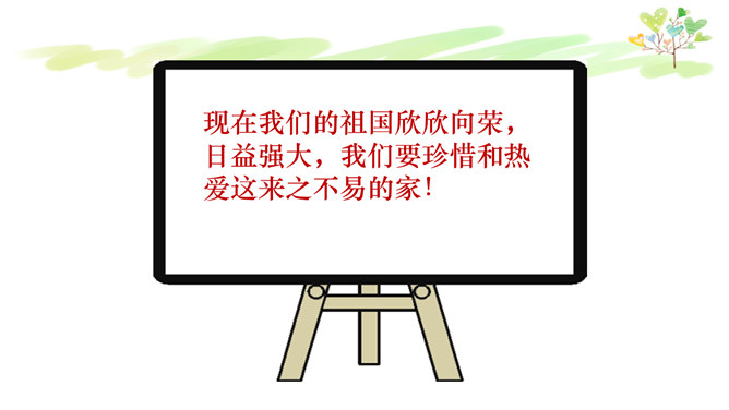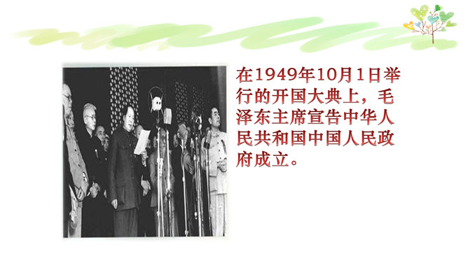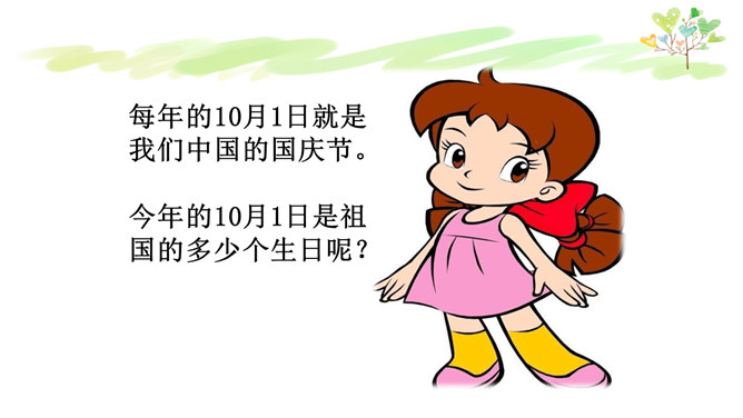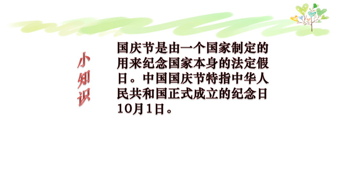 我们每个人都有生日,大家知道我们祖国生日是哪一天吗?在1949年10月1日举行的开国大典上,毛泽东主席宣告中华人民共和国中国人民政府成立。国庆节是由一个国家制定的用来纪念国家本身的法定假日。中国国庆节特指中华人民共和国正式成立的纪念日10月1日。每年的10月1日就是我们中国的国庆节。今年的10月1日是祖国的多少个生日呢?新中国的成立经历了血雨腥风,经历了万重艰辛,其中数以万计的中国儿女为此付出了鲜活的生命。新中国来之不易,说一说你所知道的英雄故事。所属专题:欢欢喜喜庆国庆ppt。