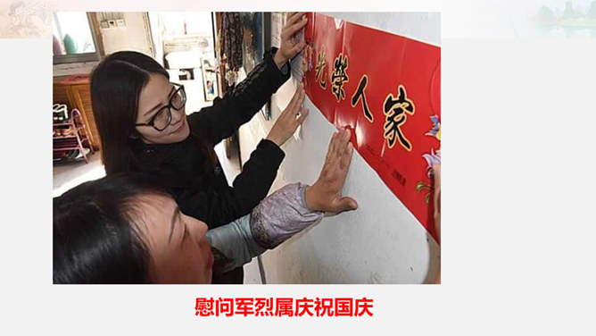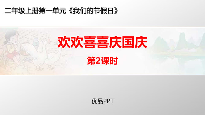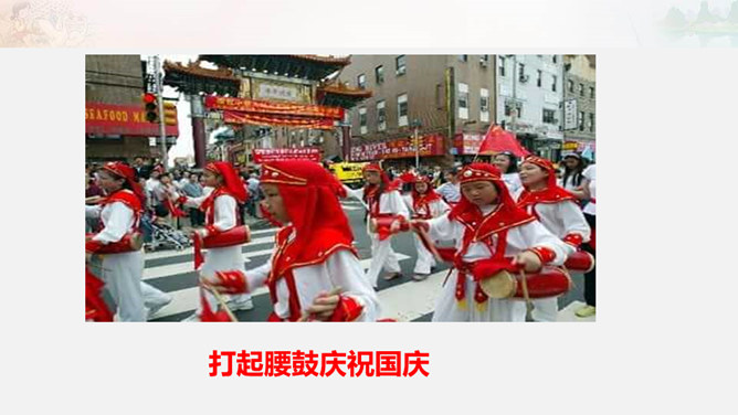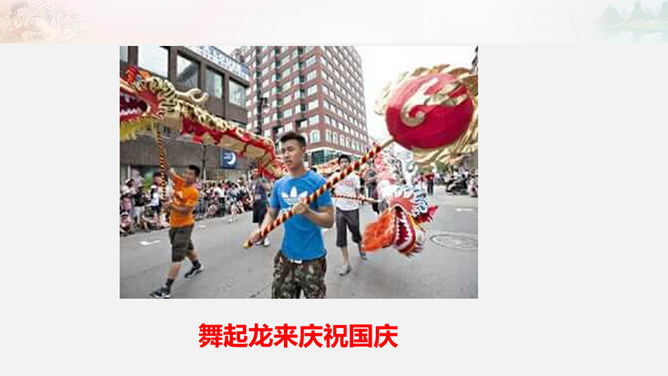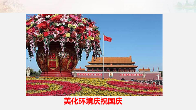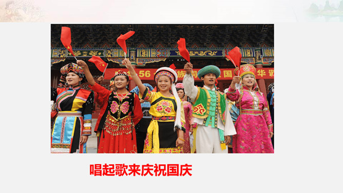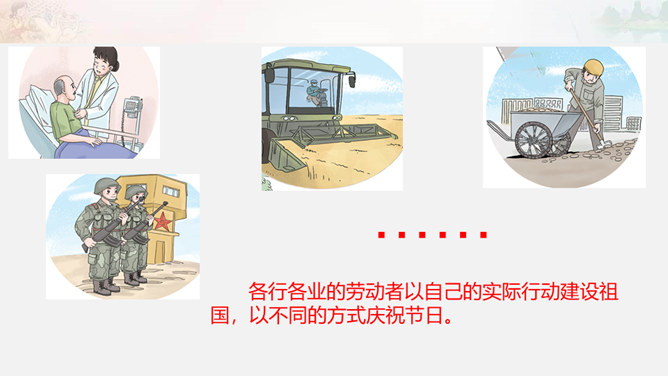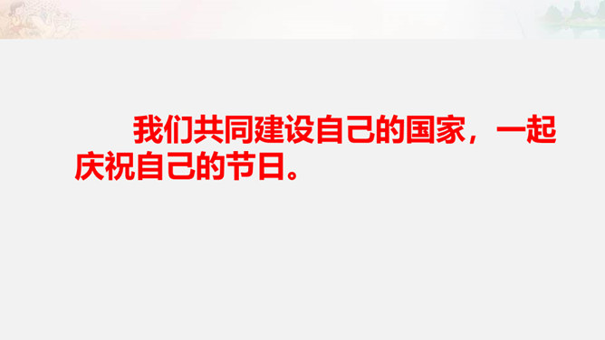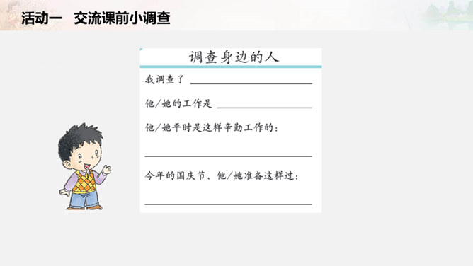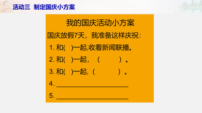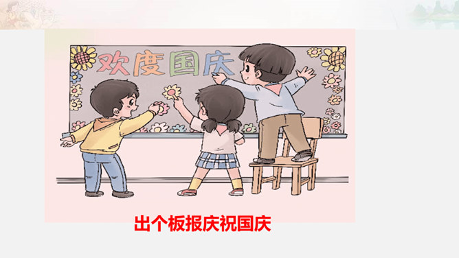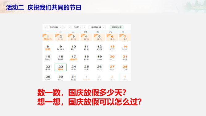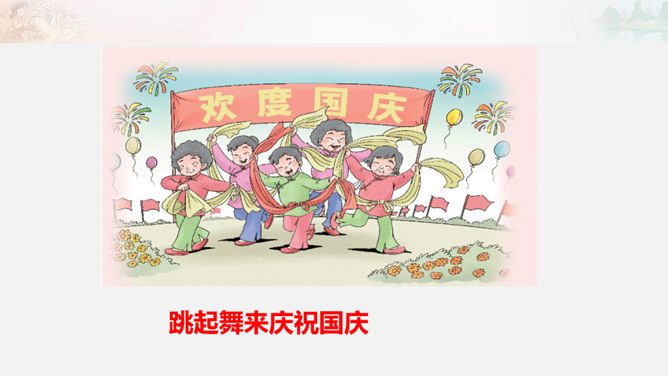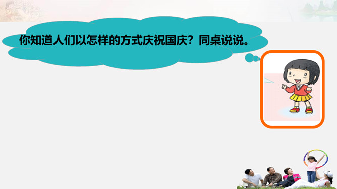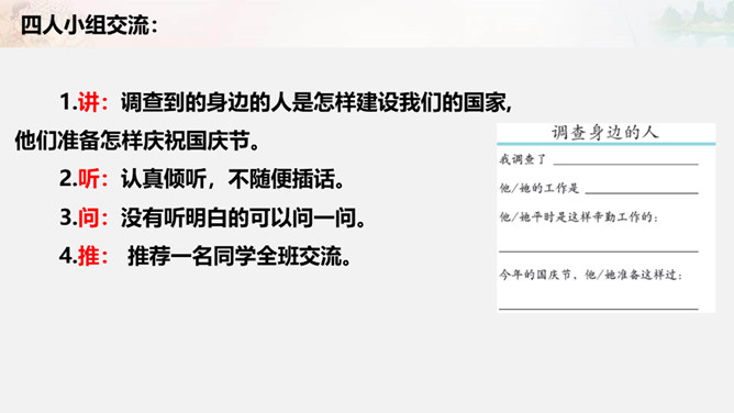 四人小组交流:1.讲:调查到的身边的人是怎样建设我们的国家,他们准备怎样庆祝国庆节。2.听:认真倾听,不随便插话。3.问:没有听明白的可以问一问。4.推: 推荐一名同学全班交流。各行各业的劳动者以自己的实际行动建设祖国,以不同的方式庆祝节日。我们共同建设自己的国家,一起庆祝自己的节日。数一数,国庆放假多少天?想一想,国庆放假可以怎么过?你知道人们以怎样的方式庆祝国庆?同桌说说。搜集歌唱祖国的歌曲,并学唱。 与爸爸妈妈交流国庆打算,让计划更合理并实施。所属专题:欢欢喜喜庆国庆ppt。