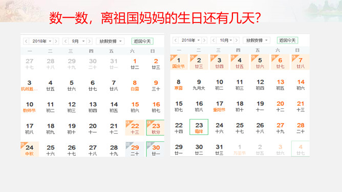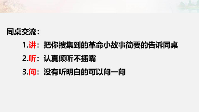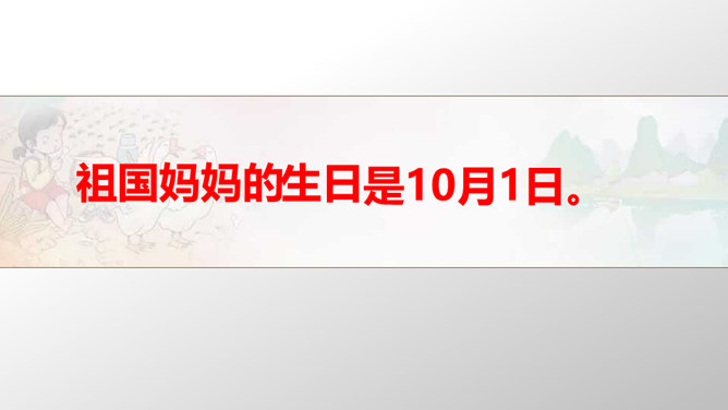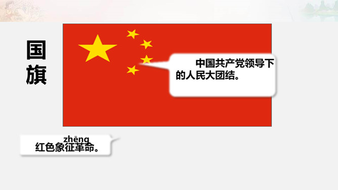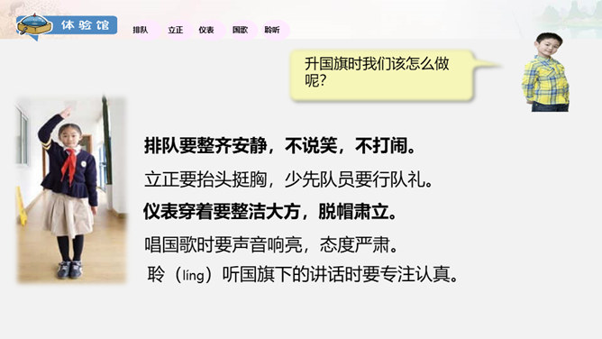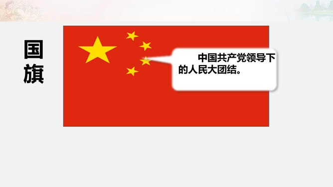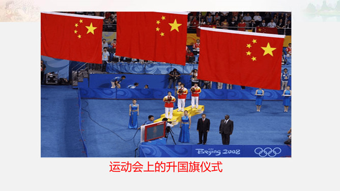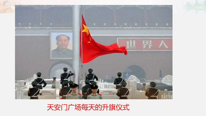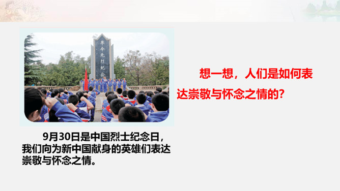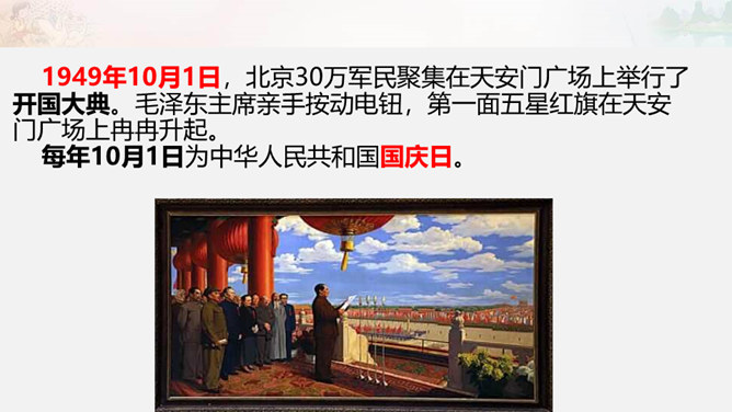 1949年10月1日,北京30万军民聚集在天安门广场上举行了开国大典。毛泽东主席亲手按动电钮,第一面五星红旗在天安门广场上冉冉升起。每年10月1日为中华人民共和国国庆日。今天的幸福生活来之不易 。我们要永远铭记他们的功勋和贡献,不忘历史,发奋图强,建设好我们的祖国!想一想,人们是如何表达崇敬与怀念之情的?9月30日是中国烈士纪念日,我们向为新中国献身的英雄们表达崇敬与怀念之情。升国旗时我们该怎么做呢?排队要整齐安静,不说笑,不打闹。立正要抬头挺胸,少先队员要行队礼。所属专题:欢欢喜喜庆国庆ppt。