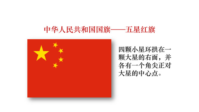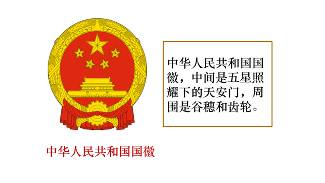 国旗、国徽、国歌都是祖国的标志象征,我们每一个人都要尊重国旗、国徽和国歌。中华人民共和国国徽,中间是五星照耀下的天安门,周围是谷穗和齿轮。四颗小星环拱在一颗大星的右面,并各有一个角尖正对大星的中心点。所属专题:欢欢喜喜庆国庆ppt。