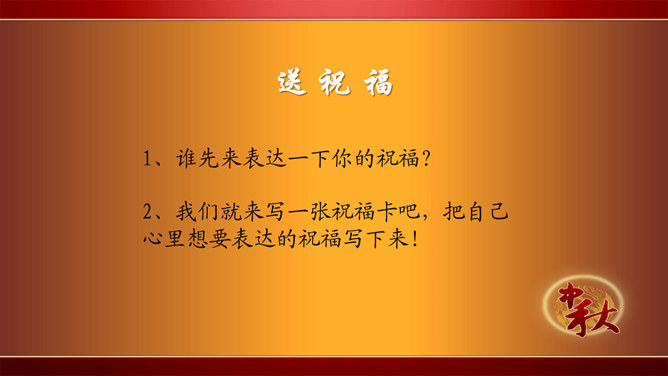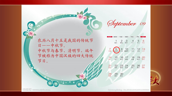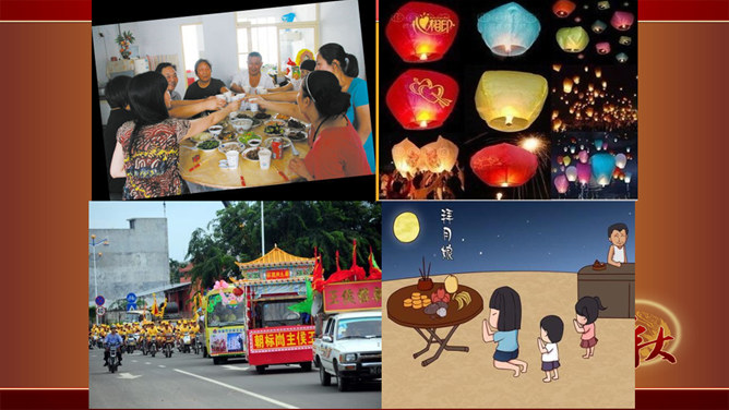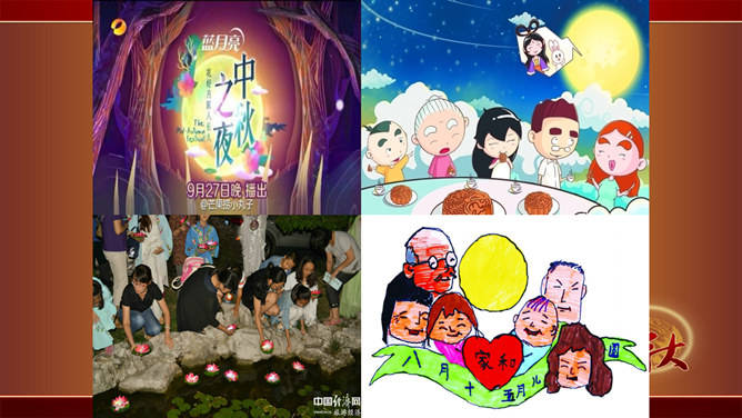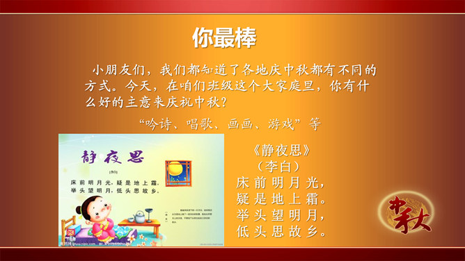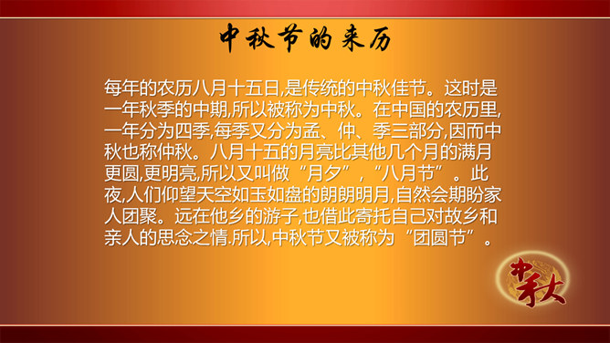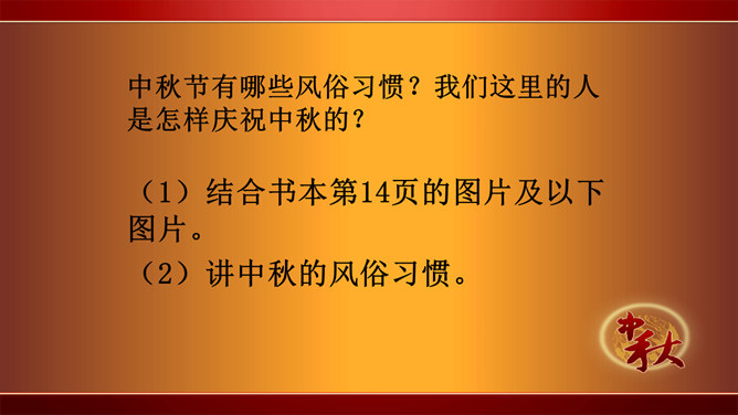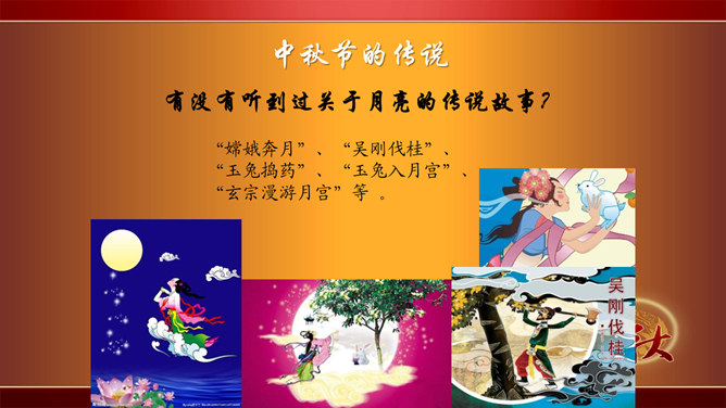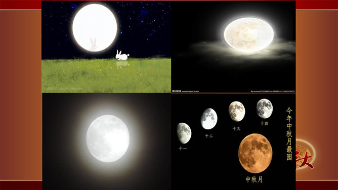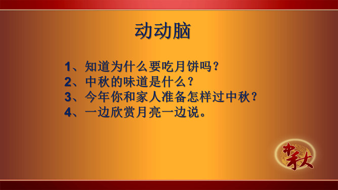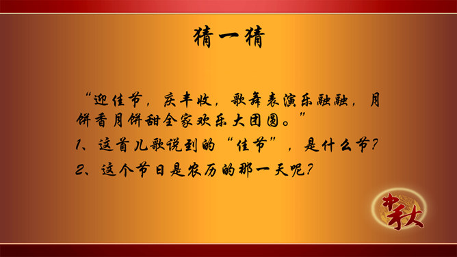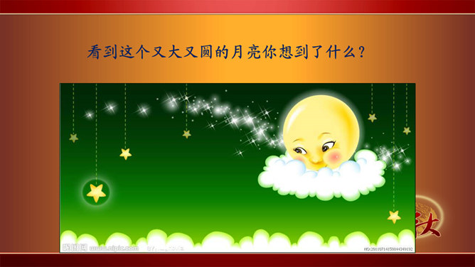 看到这个又大又圆的月亮你想到了什么?“迎佳节,庆丰收,歌舞表演乐融融,月饼香月饼甜全家欢乐大团圆。”1、这首儿歌说到的“佳节”,是什么节?2、这个节日是农历的那一天呢?农历八月十五是我国的传统节日——中秋节。中秋节与春节、清明节、端午节被称为中国汉族的四大传统节日。有没有听到过关于月亮的传说故事?“嫦娥奔月”、“吴刚伐桂”、“玉兔捣药”、“玉兔入月宫”、“玄宗漫游月宫”等 。中秋节有哪些风俗习惯?我们这里的人是怎样庆祝中秋的?所属专题:团团圆圆中秋节ppt。