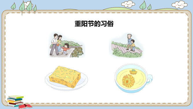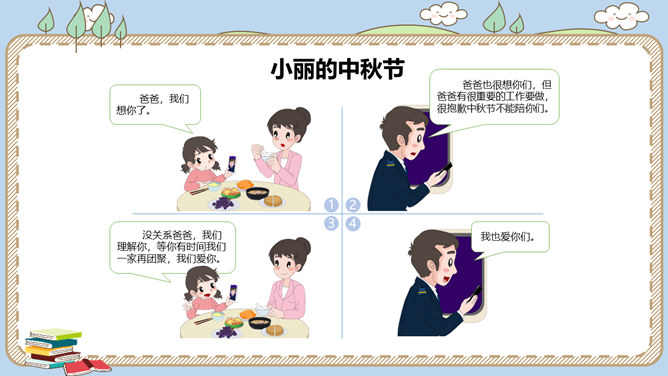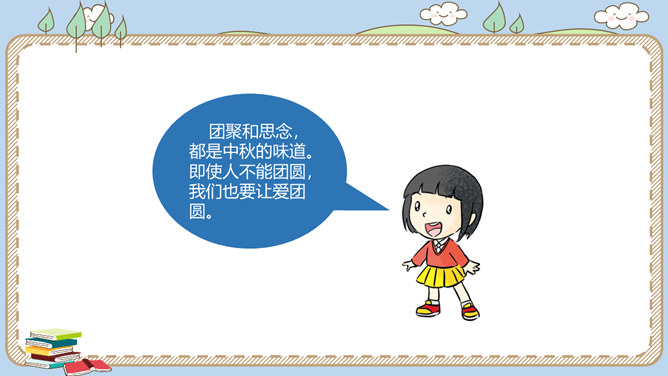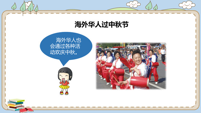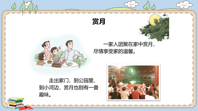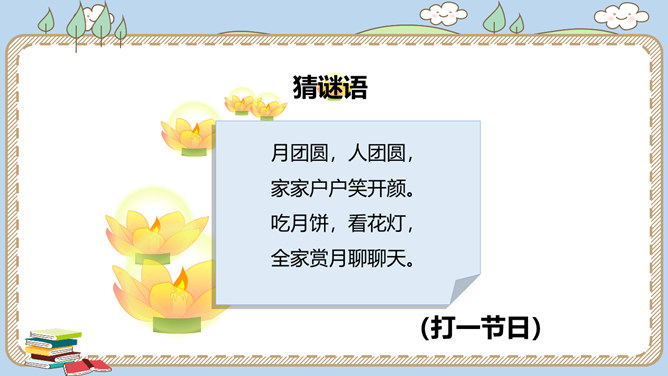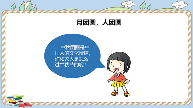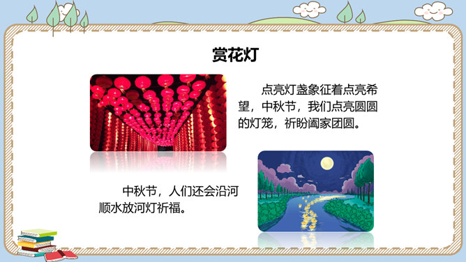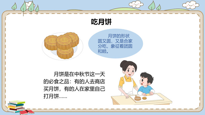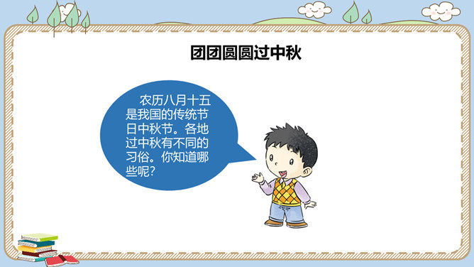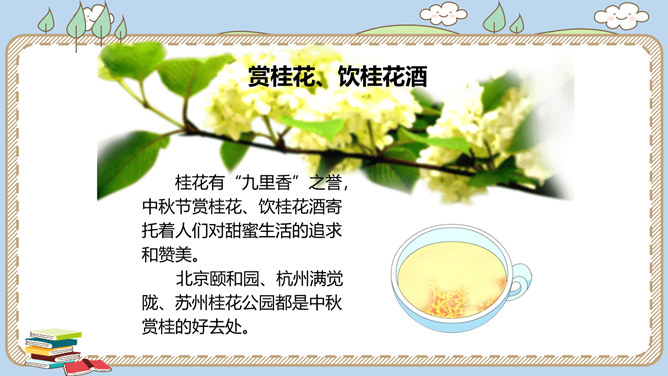 农历八月十五是我国的传统节日中秋节。各地过中秋有不同的习俗。你知道哪些呢?一家人团聚在家中赏月,尽情享受家的温馨。走出家门,到公园里,到小河边,赏月也别有一番趣味。月饼的形状圆又圆,又是合家分吃,象征着团圆和睦。月饼是在中秋节这一天的必食之品:有的人去商店买月饼,有的人在家里自己打月饼……桂花有“九里香”之誉,中秋节赏桂花、饮桂花酒寄托着人们对甜蜜生活的追求和赞美。北京颐和园、杭州满觉陇、苏州桂花公园都是中秋赏桂的好去处。中秋节,人们还会沿河顺水放河灯祈福。所属专题:团团圆圆中秋节ppt。