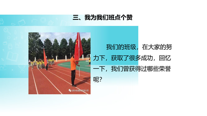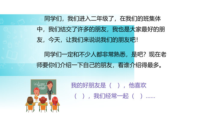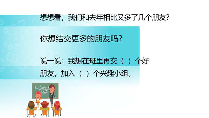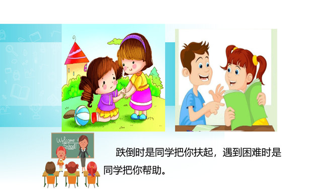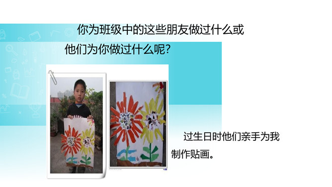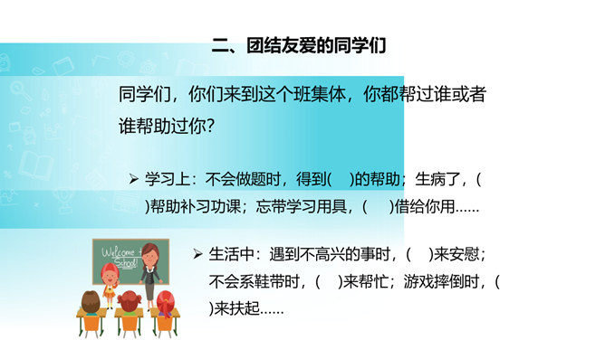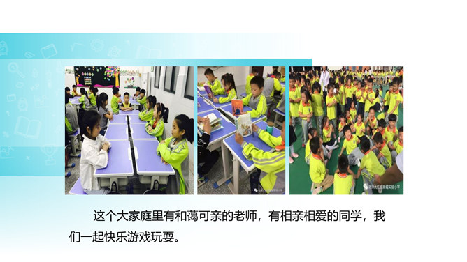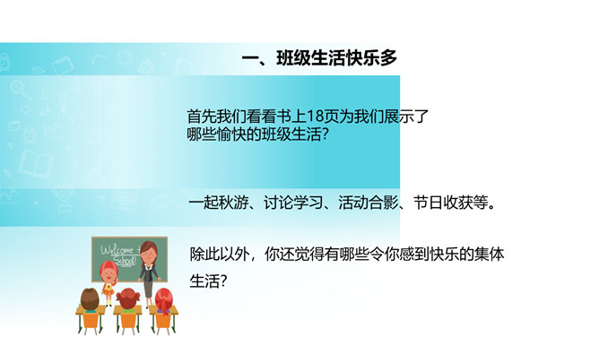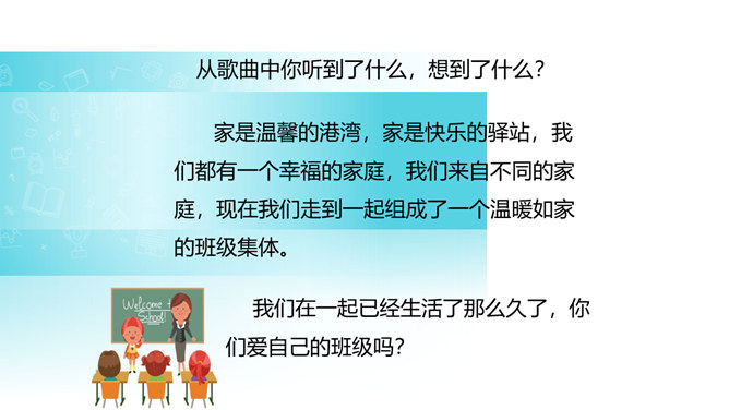 家是温馨的港湾,家是快乐的驿站,我们都有一个幸福的家庭,我们来自不同的家庭,现在我们走到一起组成了一个温暖如家的班级集体。我们在一起已经生活了那么久了,你们爱自己的班级吗?一起秋游、讨论学习、活动合影、节日收获等。除此以外,你还觉得有哪些令你感到快乐的集体生活?这个大家庭里有和蔼可亲的老师,有相亲相爱的同学,我们一起快乐游戏玩耍。跌倒时是同学把你扶起,遇到困难时是同学把你帮助。受伤时是老师把你扶起,遇到疑问时是老师帮你解答。所属专题:我爱我们班ppt。