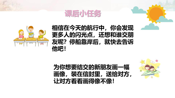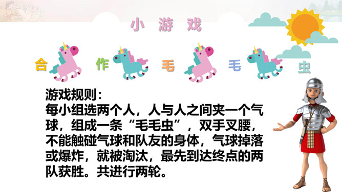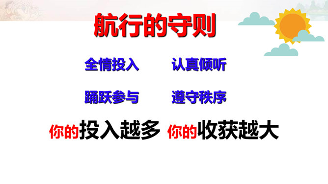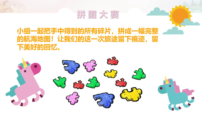 游戏规则:每小组选两个人,人与人之间夹一个气球,组成一条“毛毛虫”,双手叉腰,不能触碰气球和队友的身体,气球掉落或爆炸,就被淘汰,最先到达终点的两队获胜。共进行两轮。想一想:我们班有没有遇到过挫折呢?遇到挫折,你们又是怎么做的?小组一起把手中得到的所有碎片,拼成一幅完整的航海地图!让我们的这一次旅途留下痕迹,留下美好的回忆。我们欢聚在这里,成为一个班集体,从陌生到熟悉,永远快乐不分离。我们的班级就是一艘船,大家聚在一起,参与各种集体活动。所属专题:我爱我们班ppt。