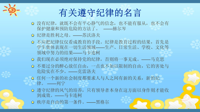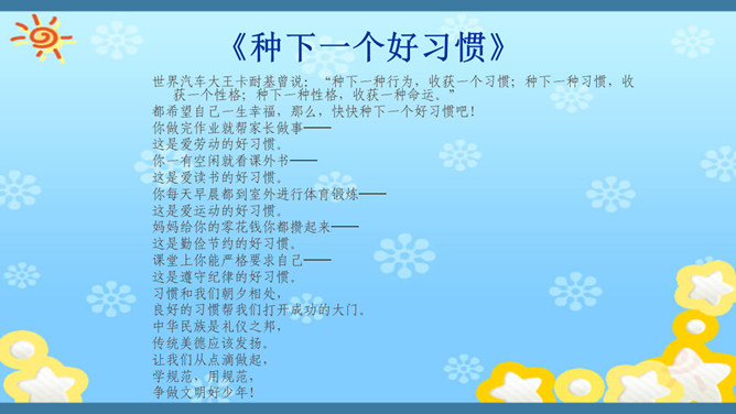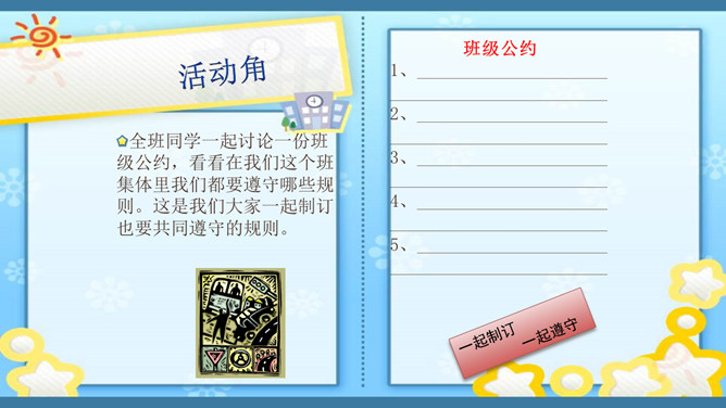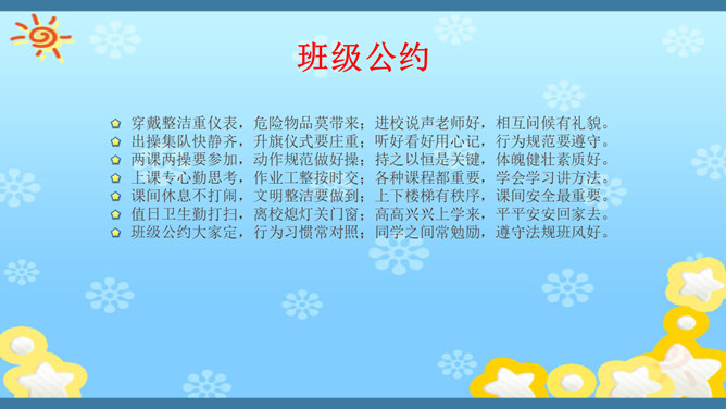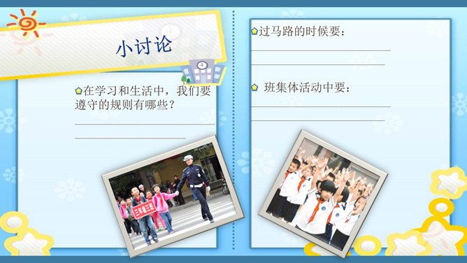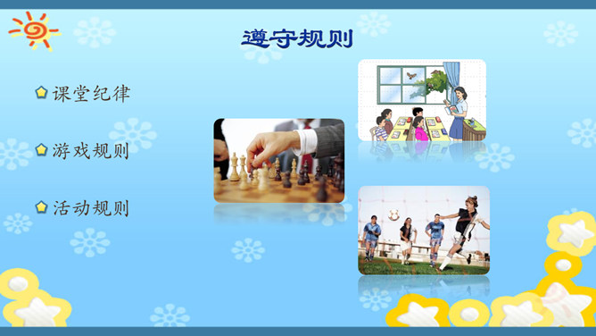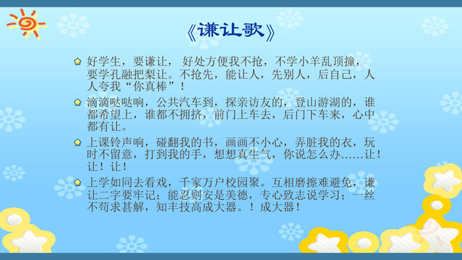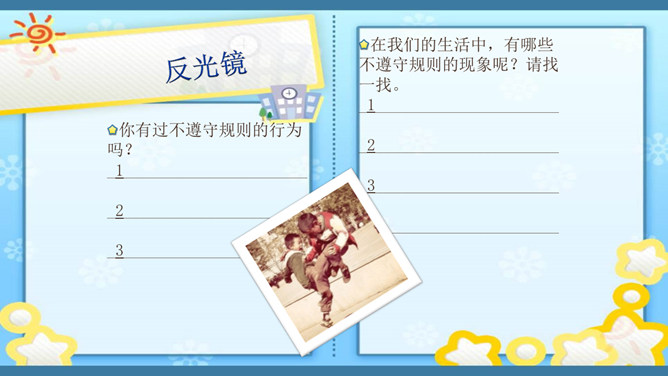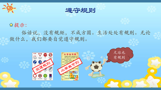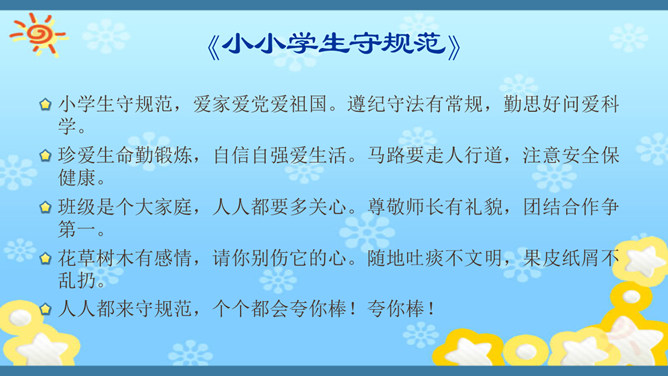 俗话说,没有规矩,不成方圆。生活处处有规则。无论做什么,我们都要自觉遵守规则。你有过不遵守规则的行为吗?在我们的生活中,有哪些不遵守规则的现象呢?请找一找。小学生守规范,爱家爱党爱祖国。遵纪守法有常规,勤思好问爱科学。珍爱生命勤锻炼,自信自强爱生活。马路要走人行道,注意安全保健康。班级是个大家庭,人人都要多关心。尊敬师长有礼貌,团结合作争第一。花草树木有感情,请你别伤它的心。随地吐痰不文明,果皮纸屑不乱扔。人人都来守规范,个个都会夸你棒!夸你棒!所属专题:班级生活有规则ppt。