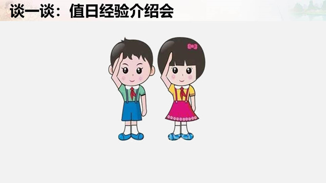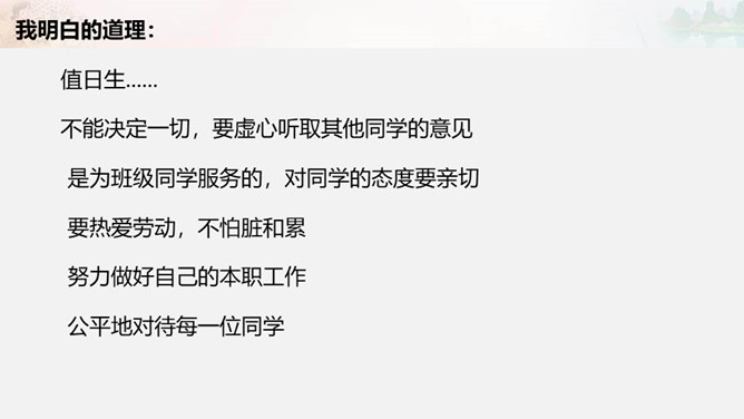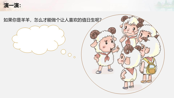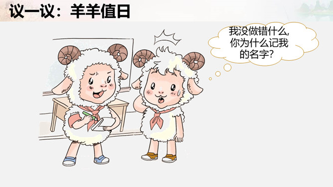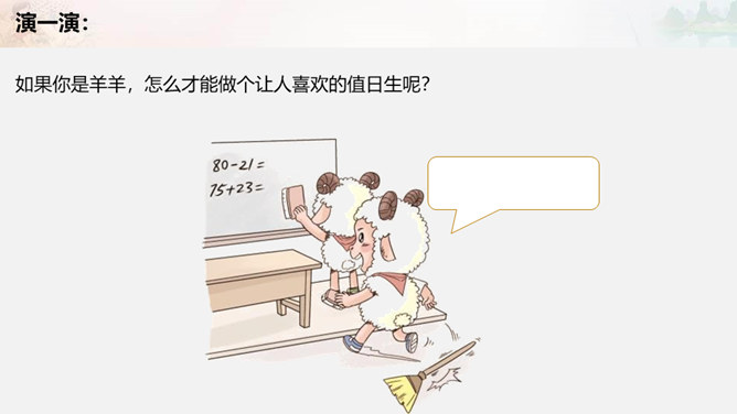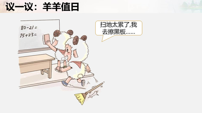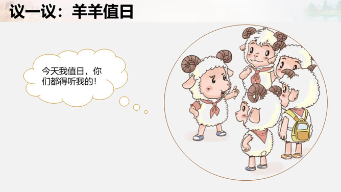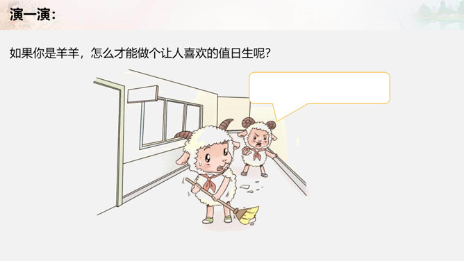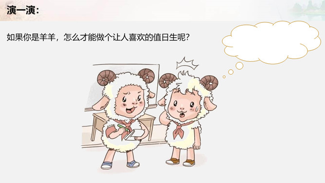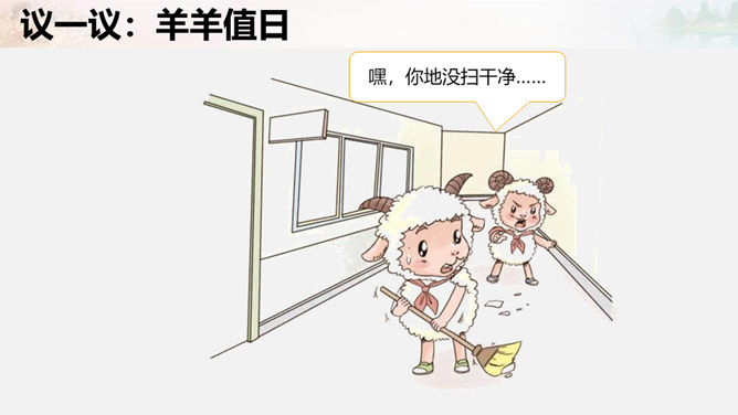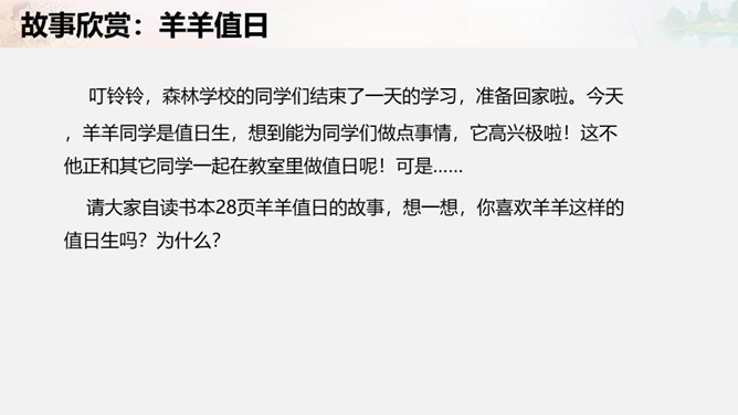 叮铃铃,森林学校的同学们结束了一天的学习,准备回家啦。今天,羊羊同学是值日生,想到能为同学们做点事情,它高兴极啦!这不他正和其它同学一起在教室里做值日呢!可是……请大家自读书本28页羊羊值日的故事,想一想,你喜欢羊羊这样的值日生吗?为什么?值日生......不能决定一切,要虚心听取其他同学的意见,是为班级同学服务的,对同学的态度要亲切要热爱劳动,不怕脏和累努力做好自己的本职工作公平地对待每一位同学。当你不是值日生,但教室却再次遇到以下情况,该怎么办呢?所属专题:我是班级值日生ppt。
