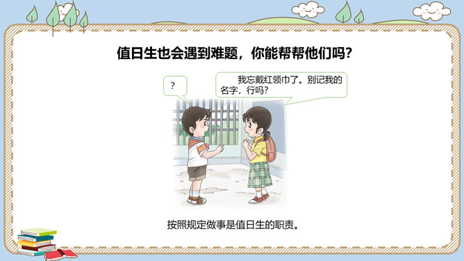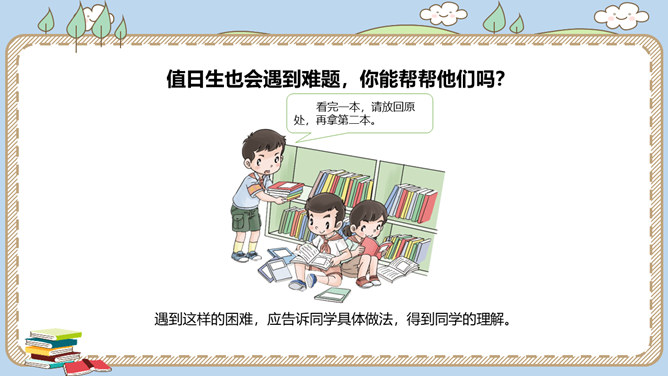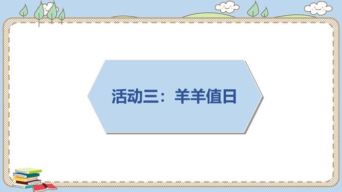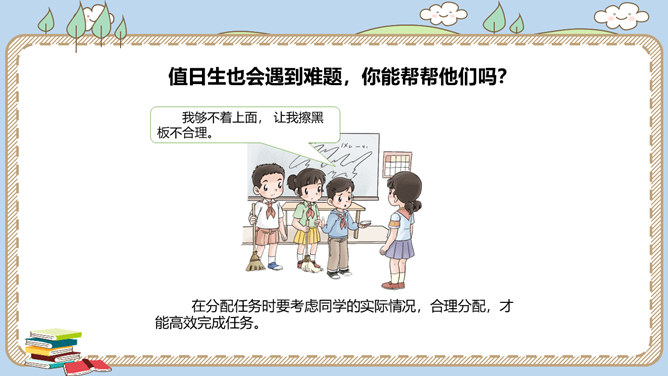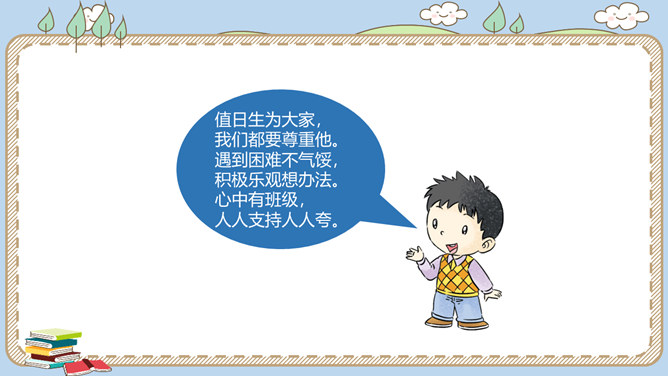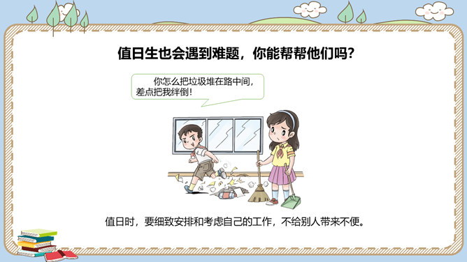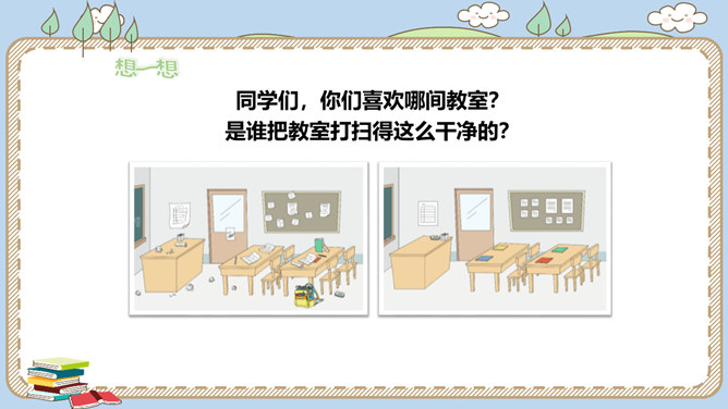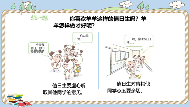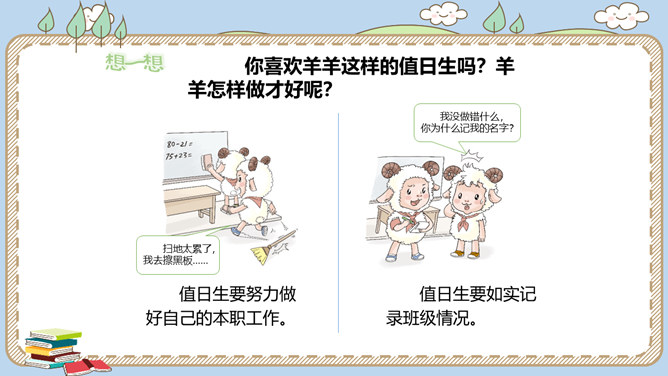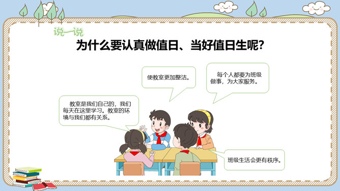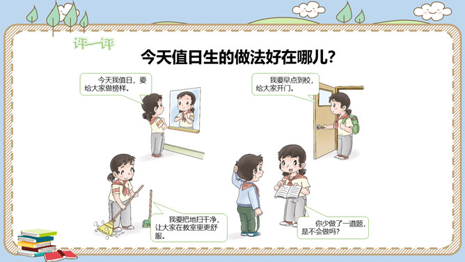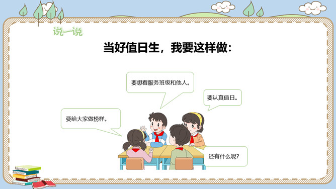 活动一:值日生 本领大。同学们,你们喜欢哪间教室?是谁把教室打扫得这么干净的?班级值日生要做哪些事情呢?为什么要认真做值日、当好值日生呢?使教室更加整洁。教室是我们自己的,我们每天在这里学习。教室的环境与我们都有关系。每个人都要为班级做事,为大家服务。班级生活会更有秩序。今天值日生的做法好在哪儿?今天我值日,要给大家做榜样。我要早点到校, 给大家开门。我要把地扫干净,让大家在教室里更舒服。你少做了一道题, 是不会做吗?当好值日生,我要这样做:要想着服务班级和他人。所属专题:我是班级值日生ppt。