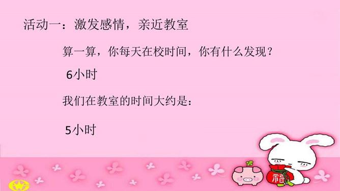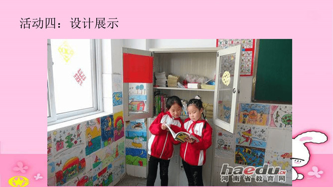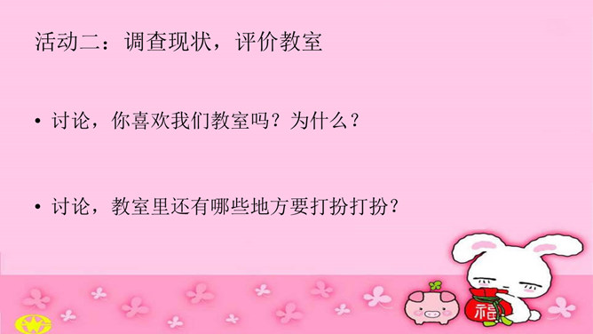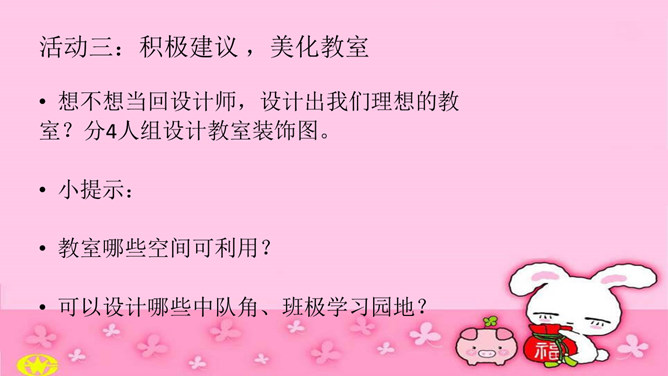 活动一:激发感情,亲近教室。算一算,你每天在校时间,你有什么发现?教室就是我们的家。你希望我们的教室是怎么样的?图片中的教室有什么特点?教室是我家,我们都爱它。活动二:调查现状,评价教室。讨论,你喜欢我们教室吗?为什么?讨论,教室里还有哪些地方要打扮打扮?活动三:积极建议 ,美化教室。想不想当回设计师,设计出我们理想的教室?分4人组设计教室装饰图。小提示:教室哪些空间可利用?可以设计哪些中队角、班极学习园地?活动四:设计展示。所属专题:装扮我们的教室ppt。