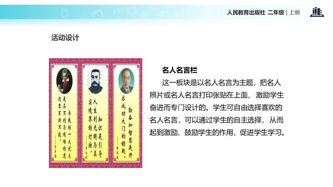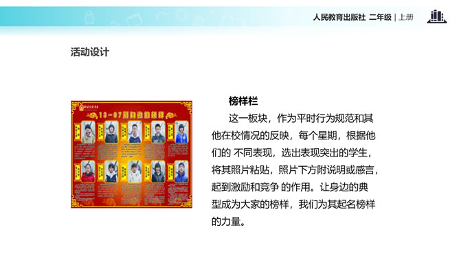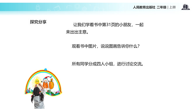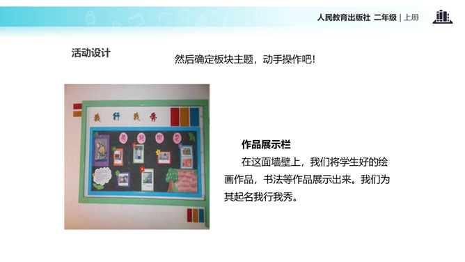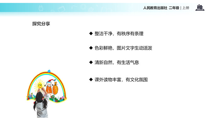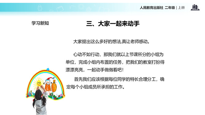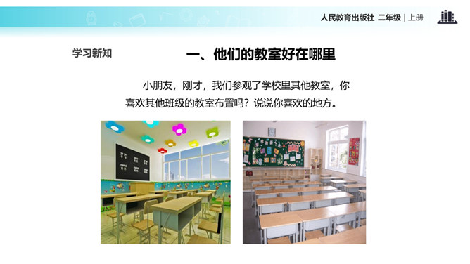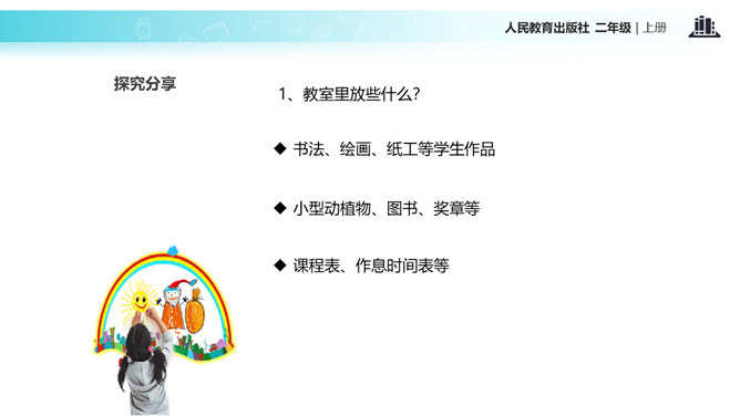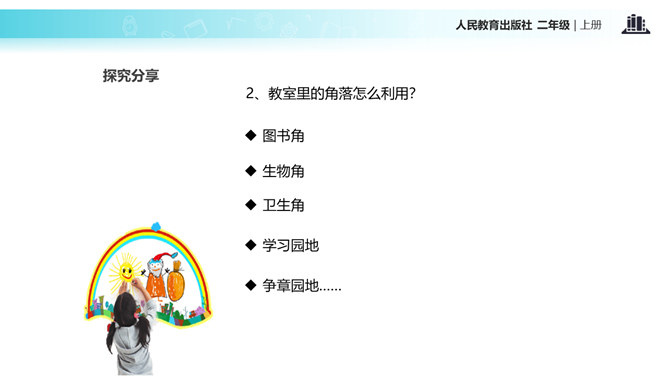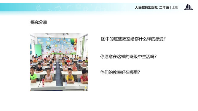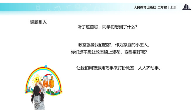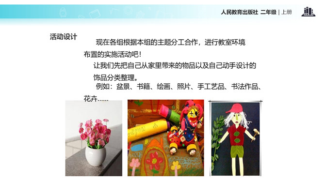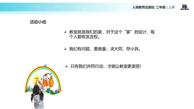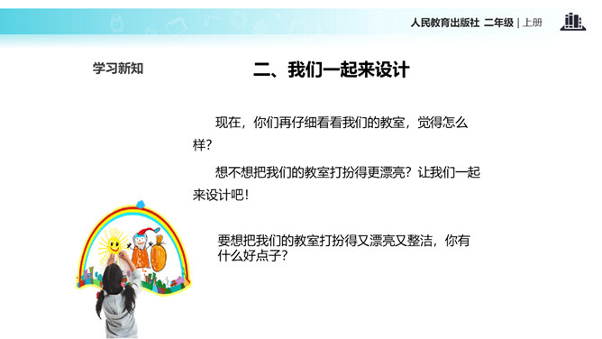 教室就像我们的家,作为家庭的小主人,你们想不想让教室锦上添花,变得更好呢?让我们用智慧用巧手来打扮教室,人人齐动手。小朋友,刚才,我们参观了学校里其他教室,你喜欢其他班级的教室布置吗?说说你喜欢的地方。现在,你们再仔细看看我们的教室,觉得怎么样?想不想把我们的教室打扮得更漂亮?让我们一起来设计吧!要想把我们的教室打扮得又漂亮又整洁,你有什么好点子?教室就是我们的家,对于这个“家”的设计,每个人都有发言权。我们有问题,要商量;求大同,存小异。所属专题:装扮我们的教室ppt。