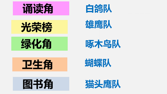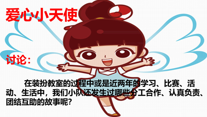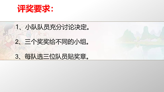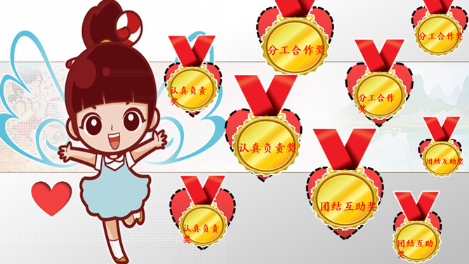评奖要求:1、小队队员充分讨论决定。2、三个奖奖给不同的小组。3、每队选三位队员贴奖章。在装扮教室的过程中或是近两年的学习、比赛、活动、生活中,我们小队还发生过哪些分工合作、认真负责、团结互助的故事呢?所属专题:装扮我们的教室ppt。