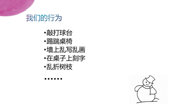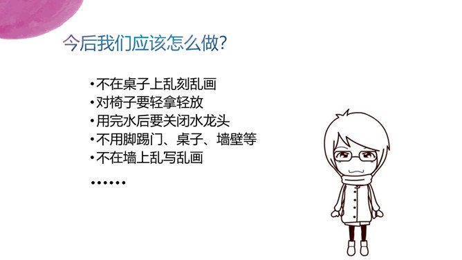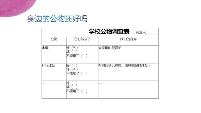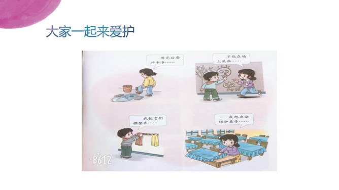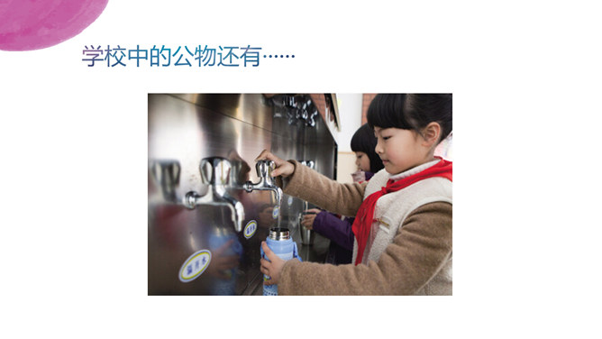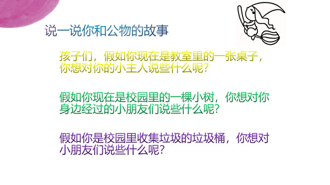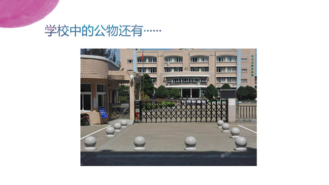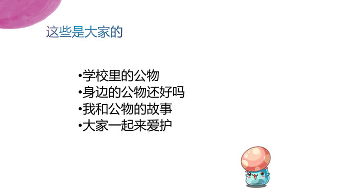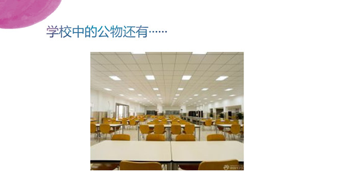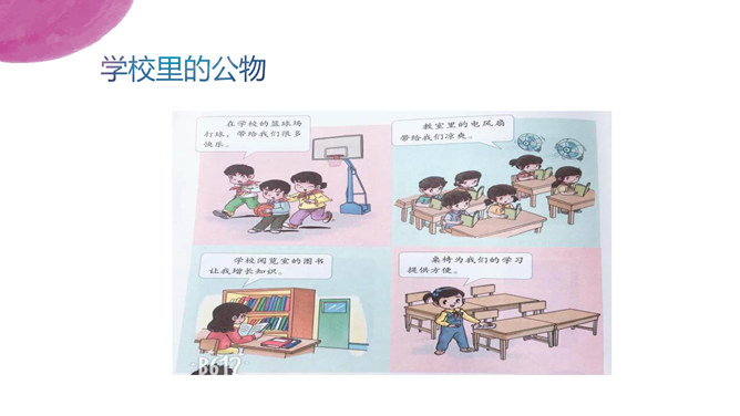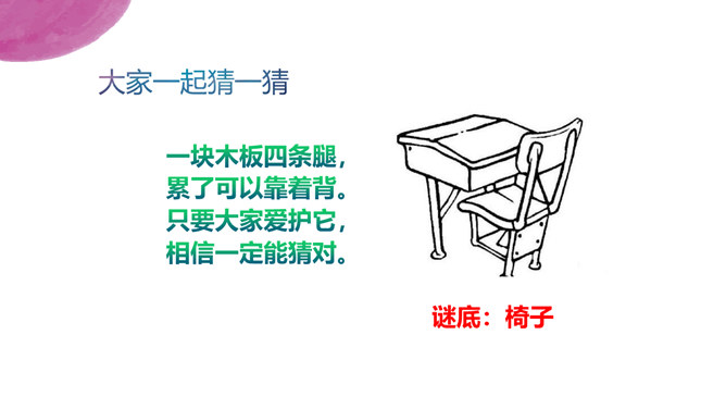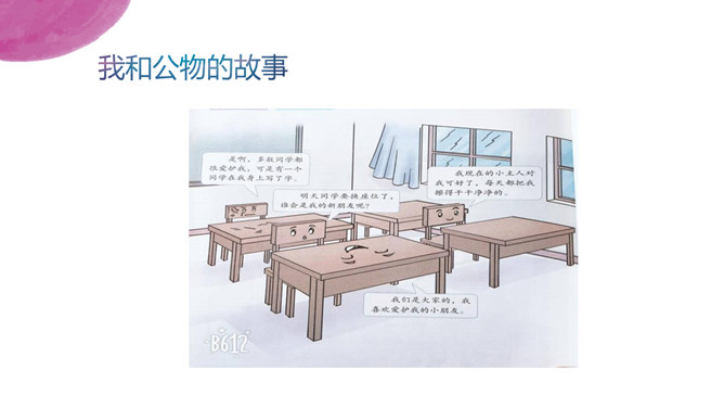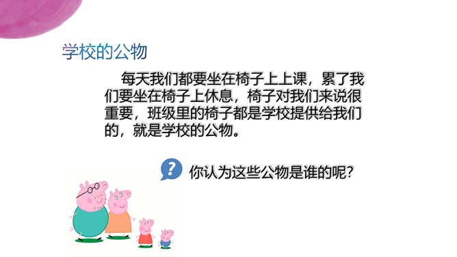 大家一起猜一猜:一块木板四条腿,累了可以靠着背。只要大家爱护它,相信一定能猜对。每天我们都要坐在椅子上上课,累了我们要坐在椅子上休息,椅子对我们来说很重要,班级里的椅子都是学校提供给我们的,就是学校的公物。你认为这些公物是谁的呢?孩子们,假如你现在是教室里的一张桌子,你想对你的小主人说些什么呢?假如你现在是校园里的一棵小树,你想对你身边经过的小朋友们说些什么呢?假如你是校园里收集垃圾的垃圾桶,你想对小朋友们说些什么呢?所属专题:这些是大家的ppt。