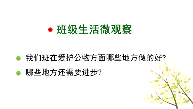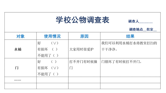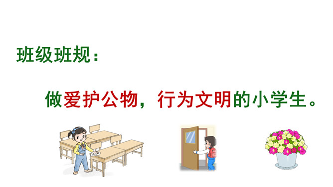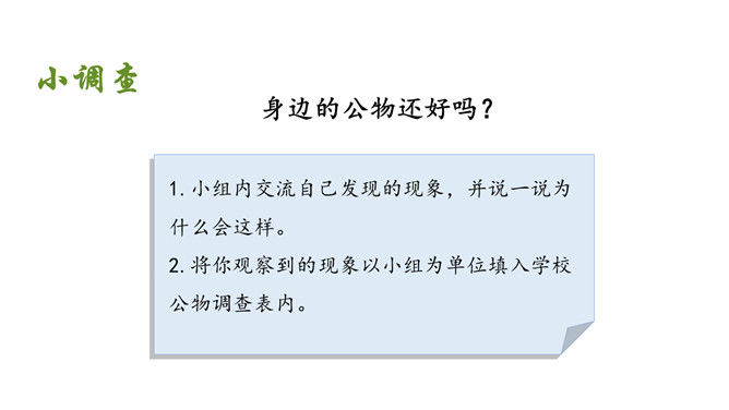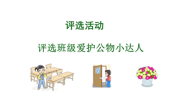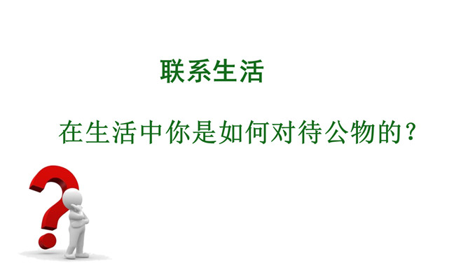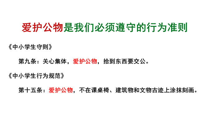 我怎么会变成这样子的呢?爱护公物是我们必须遵守的行为准则:《中小学生守则》第九条:关心集体,爱护公物,拾到东西要交公。《中小学生行为规范》第十五条:爱护公物,不在课桌椅、建筑物和文物古迹上涂抹刻画。身边的公物还好吗?1.小组内交流自己发现的现象,并说一说为什么会这样。2.将你观察到的现象以小组为单位填入学校公物调查表内。规范自己的行为,做行为文明的小学生。联系生活在生活中你是如何对待公物的?评选活动评选班级爱护公物小达人。班级班规:做爱护公物,行为文明的小学生。所属专题:这些是大家的ppt。
