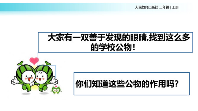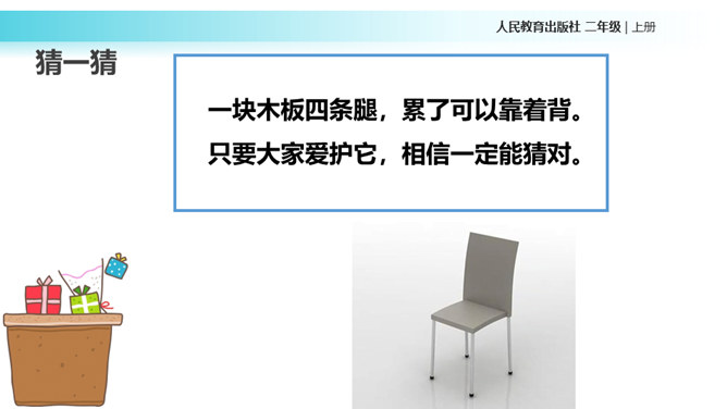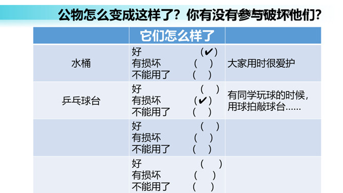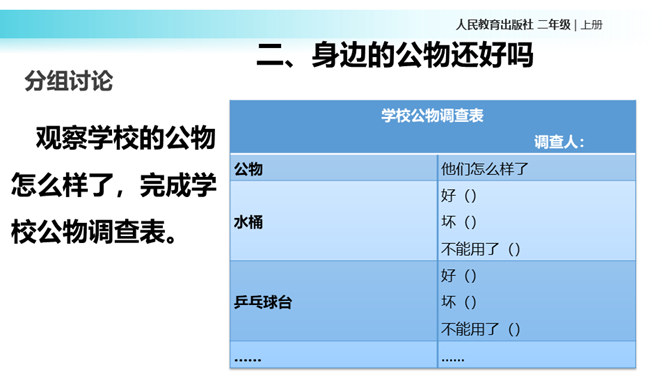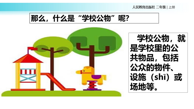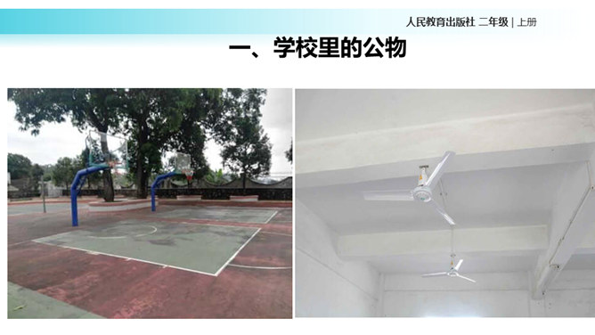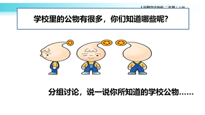 猜一猜:一块木板四条腿,累了可以靠着背。只要大家爱护它,相信一定能猜对。那么,什么是“学校公物”呢?学校公物,就是学校里的公共物品,包括公众的物件、设施或场地等。学校里的公物有很多,你们知道哪些呢?分组讨论,说一说你所知道的学校公物……大家有一双善于发现的眼睛,找到这么多的学校公物!你们知道这些公物的作用吗?在学校篮球场打球,带给我们很多快乐又锻炼了我们的身体。学校阅览室的图书让我增长了知识。学校的桌椅为我们的学习提供了便利。所属专题:这些是大家的ppt。