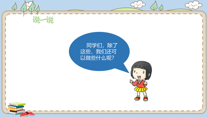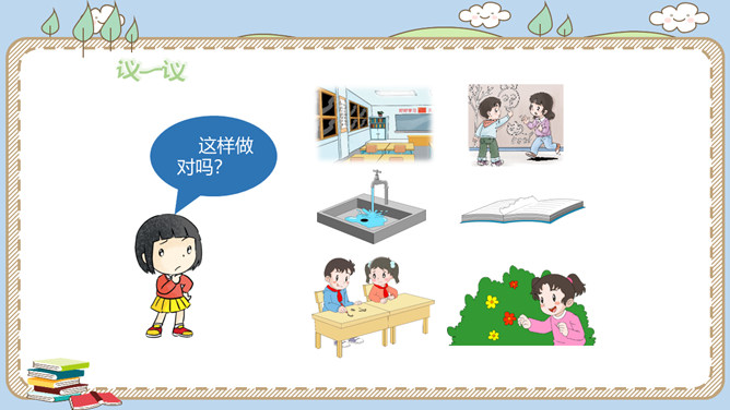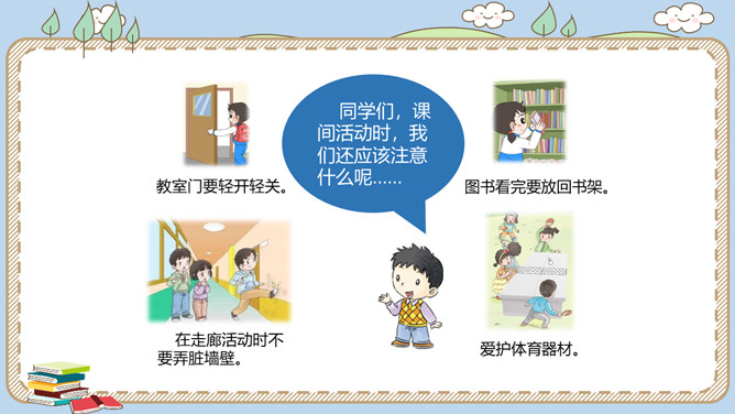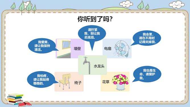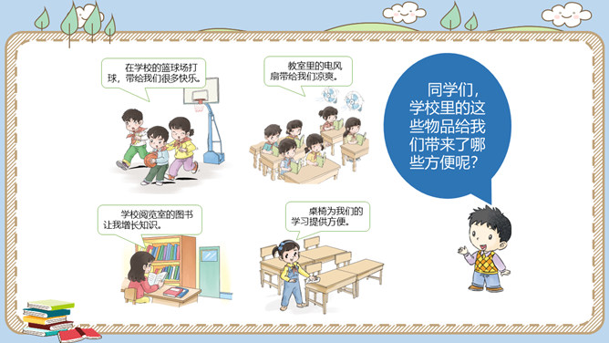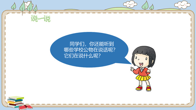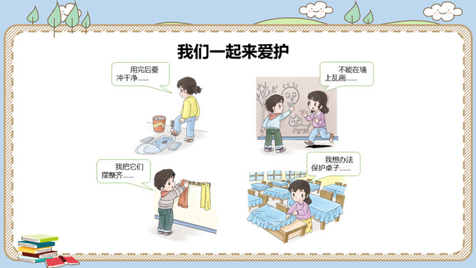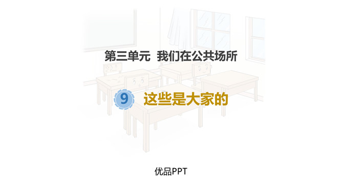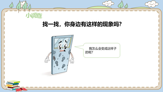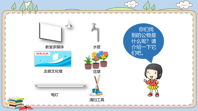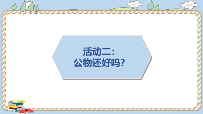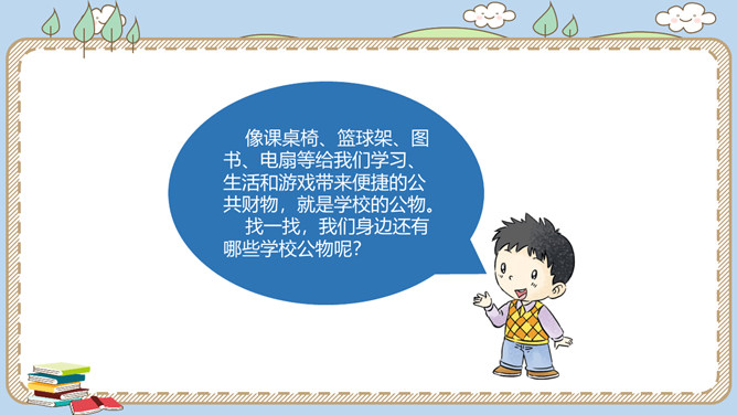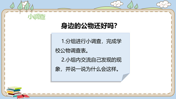 活动一: 认识学校公物。同学们,学校里的这些物品给我们带来了哪些方便呢?像课桌椅、篮球架、图书、电扇等给我们学习、生活和游戏带来便捷的公共财物,就是学校的公物。找一找,我们身边还有哪些学校公物呢?你们找到的公物是什么呢?请介绍一下它们吧。活动二:公物还好吗?找一找,你身边有这样的现象吗?1.分组进行小调查,完成学校公物调查表。2.小组内交流自己发现的现象,并说一说为什么会这样。活动三:听听它们怎么说。同学们,你还能听到哪些学校公物在说话呢?它们在说什么呢?所属专题:这些是大家的ppt。
