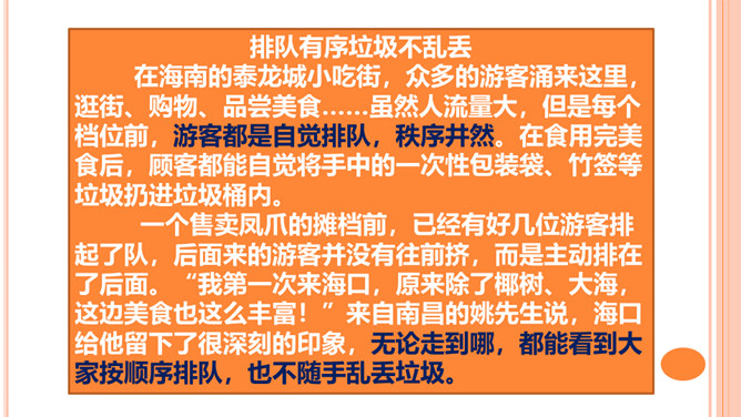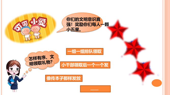 说说你喜欢哪一种发作业本的方式?为什么?你们的文明意识真强!奖励你们每人一颗小五星。怎样有序、文明领取礼物?一组一组排队领取。小干部领取后一个一个发。像传本子那样发放。哇,好美的夜景,好绚丽的灯光。可是,2014年12月31日,上海外滩发生踩踏事故,36个年轻的生命结束在这个夜晚。如果有人在排好的队伍中插进去,你会怎么想?所属专题:大家排好队ppt。