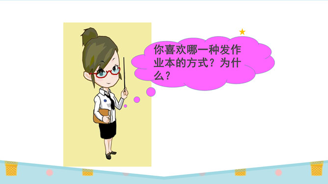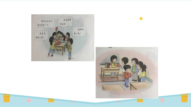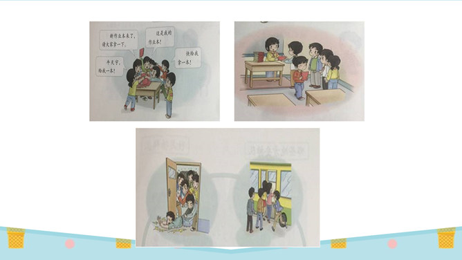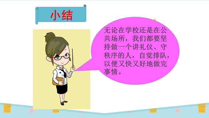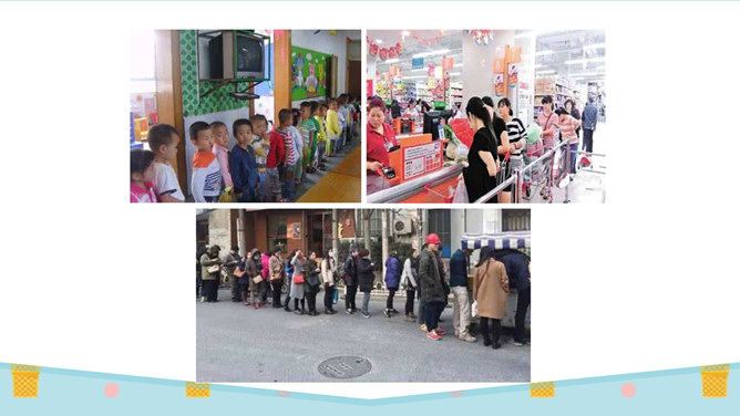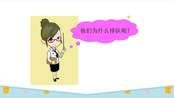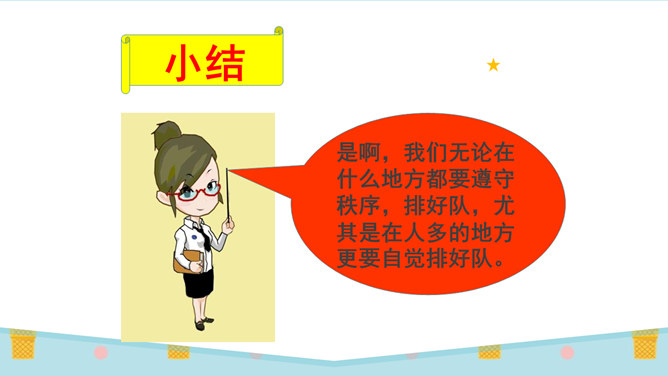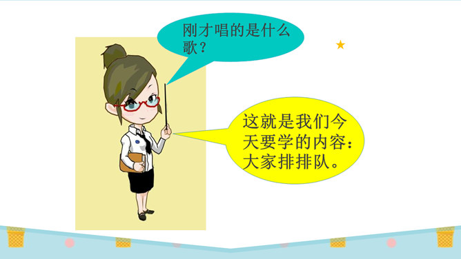 刚才唱的是什么歌?这就是我们今天要学的内容:大家排排队。你喜欢哪一种发作业本的方式?为什么?第二种,因为发作业本又快又不挤。图中的小朋友做得对吗?为什么?看到这些,你们想说什么?是啊,我们无论在什么地方都要遵守秩序,排好队,尤其是在人多的地方更要自觉排好队。无论在学校还是在公共场所,我们都要坚持做一个讲礼仪、守秩序的人,自觉排队,以便又快又好地做完事情。这两幅图中的人们正在做什么?他们这样做对吗?他们为什么那么做?所属专题:大家排好队ppt。