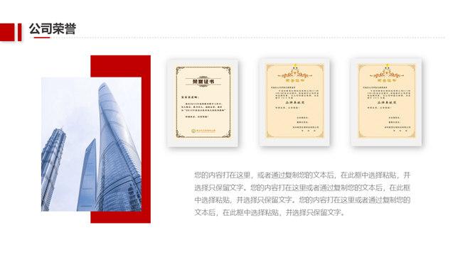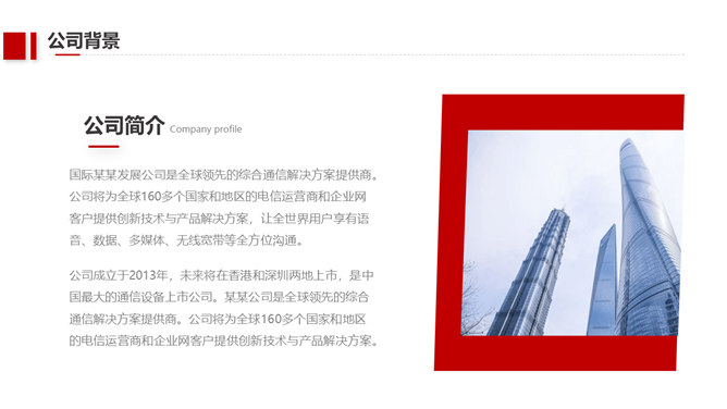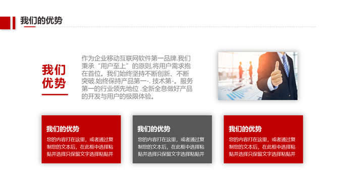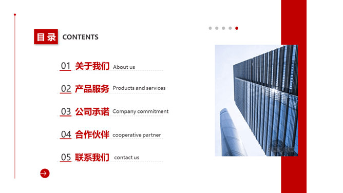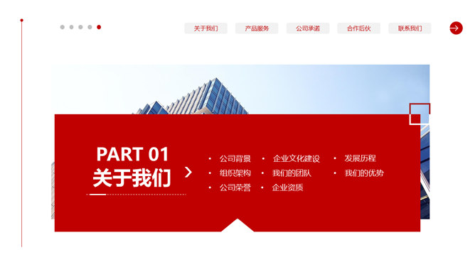 企业宣传公司介绍PPT模板。一套公司企业宣传介绍幻灯片模板,红色主色调,简约大气商务风,包括关于我们、产品服务、公司承诺、合作伙伴、联系我们等内容。