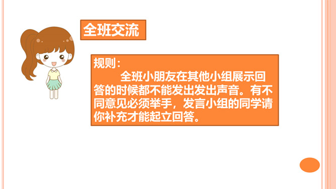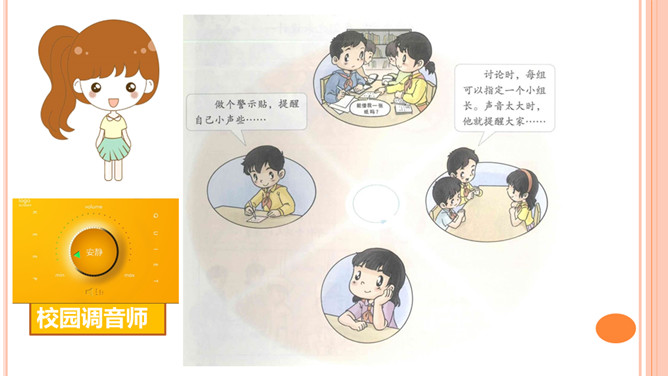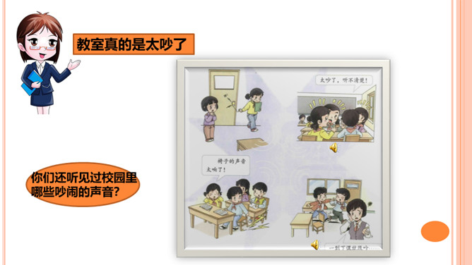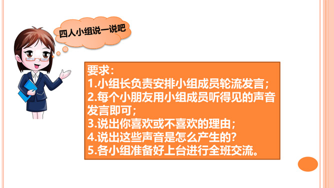 拉铃啦。听,这是什么声音?你们还听见过校园里哪些吵闹的声音?要求:1.小组长负责安排小组成员轮流发言;2.每个小朋友用小组成员听得见的声音发言即可;3.说出你喜欢或不喜欢的理由;4.说出这些声音是怎么产生的?5.各小组准备好上台进行全班交流。规则:全班小朋友在其他小组展示回答的时候都不能发出发出声音。有不同意见必须举手,发言小组的同学请你补充才能起立回答。所属专题:我们小点儿声ppt。