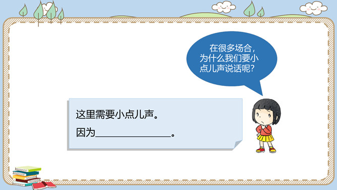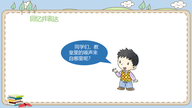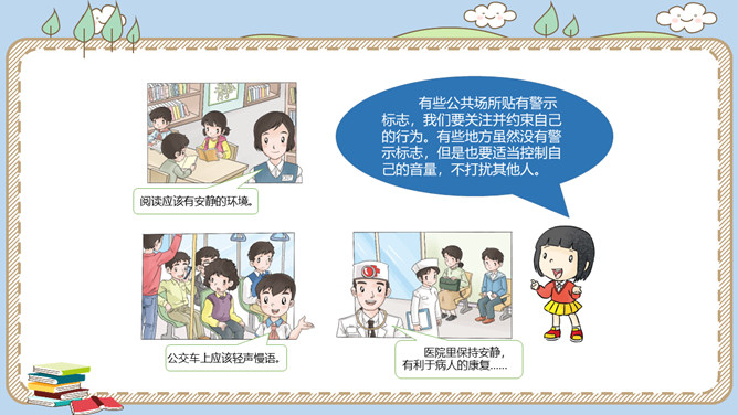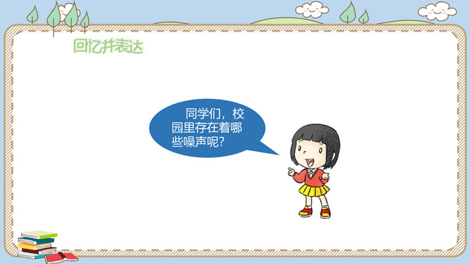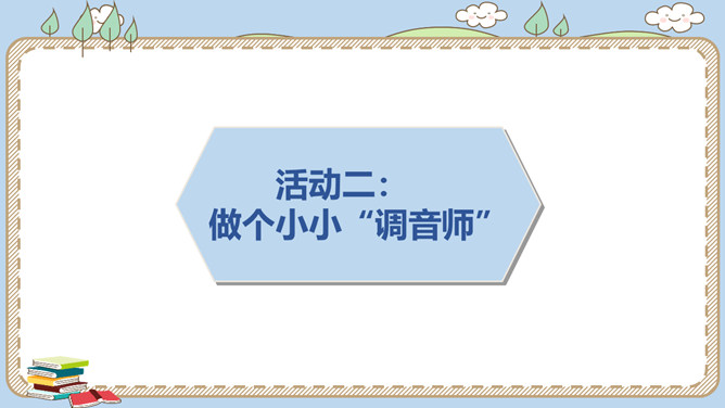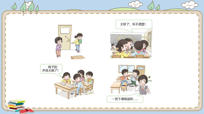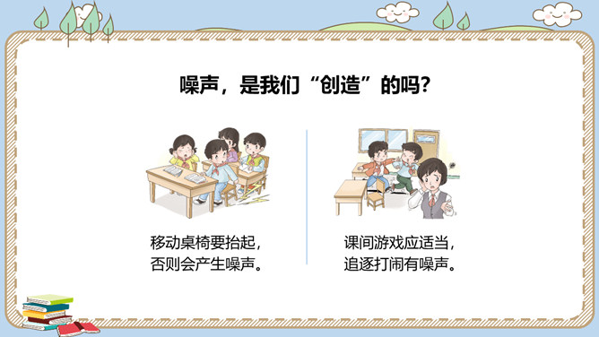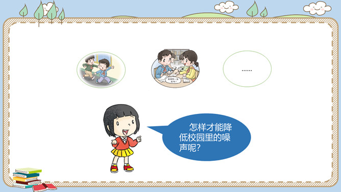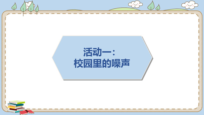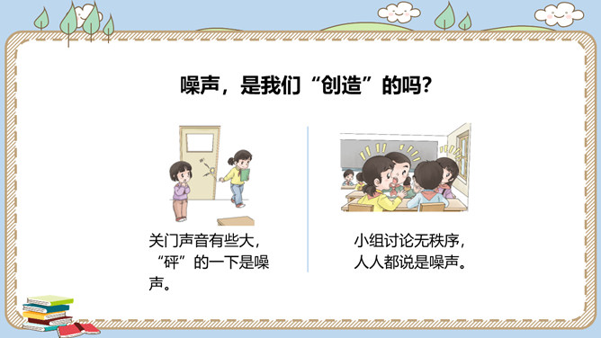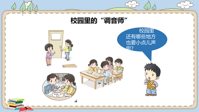 活动一:校园里的噪声。同学们,教室里的噪声来自哪里呢?噪声,是我们“创造”的吗?关门声音有些大,“砰”的一下是噪声。小组讨论无秩序,人人都说是噪声。移动桌椅要抬起,否则会产生噪声。课间游戏应适当,追逐打闹有噪声。同学们,校园里存在着哪些噪声呢?怎样才能降低校园里的噪声呢?活动二:做个小小“调音师”。校园里还有哪些地方也要小点儿声呢?有些公共场所贴有警示标志,我们要关注并约束自己的行为。有些地方虽然没有警示标志,但是也要适当控制自己的音量,不打扰其他人。所属专题:我们小点儿声ppt。