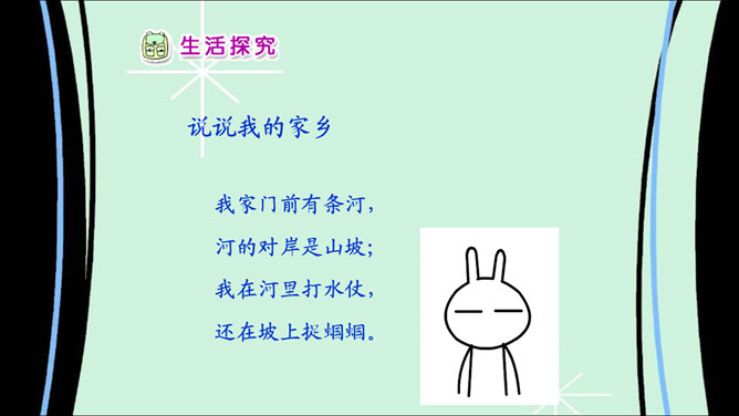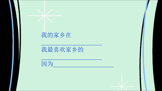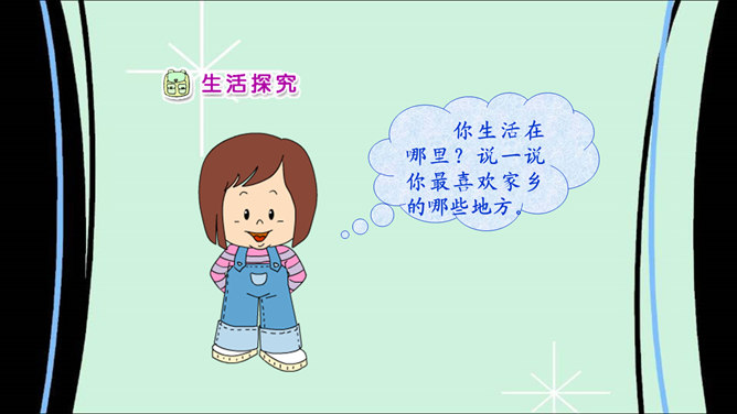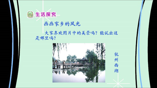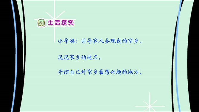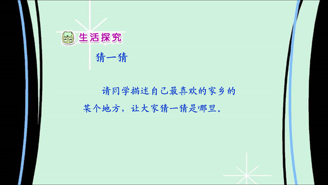 说说我的家乡:我家门前有条河,河的对岸是山坡;我在河里打水仗,还在坡上捉蝈蝈。你生活在哪里?说一说你最喜欢家乡的哪些地方。导游:引导客人参观我的家乡。说说家乡的地名。介绍自己对家乡最感兴趣的地方。请同学描述自己最喜欢的家乡的某个地方,让大家猜一猜是哪里。大家喜欢图片中的美景吗?能说出这是哪里吗?让我们也来画画自己的家乡。也把你画的画儿,拿给大家看看吧。把下面的儿歌补充完整,再念一念。 家乡的山,青青的;家乡的水,甜甜的;家乡的草,绿绿的;家乡的楼,高高的。所属专题:我爱家乡山和水ppt。