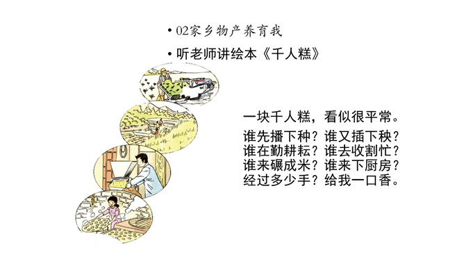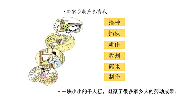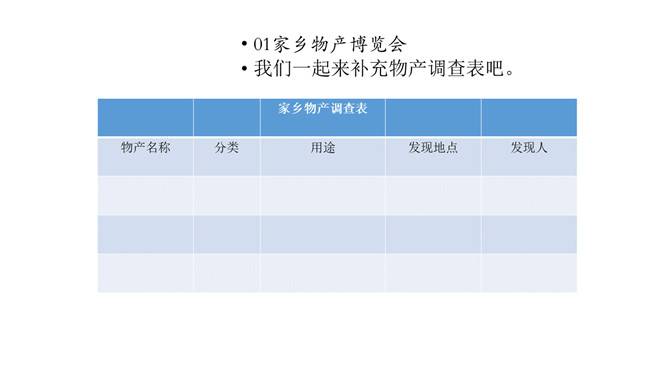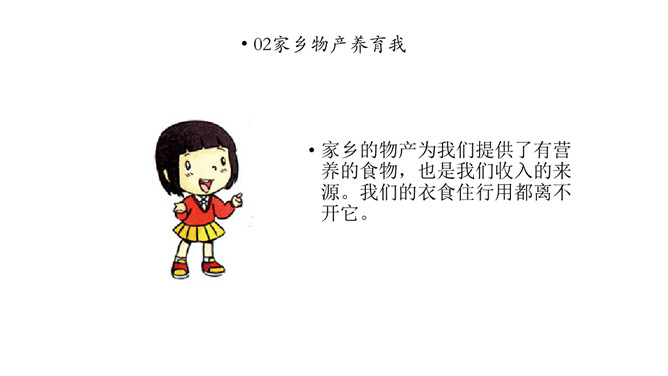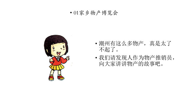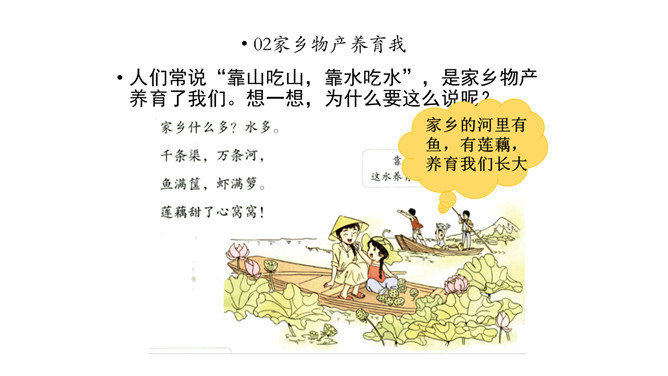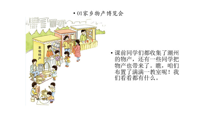 课前同学们都收集了潮州的物产,还有一些同学把物产也带来了。瞧,咱们布置了满满一教室呢!我们看看都有什么。我们一起来补充物产调查表吧。我们请发现人作为物产推销员,向大家讲讲物产的故事吧。人们常说“靠山吃山,靠水吃水”,是家乡物产养育了我们。想一想,为什么要这么说呢?家乡的物产为我们提供了有营养的食物,也是我们收入的来源。我们的衣食住行用都离不开它。所属专题:家乡物产养育我ppt。