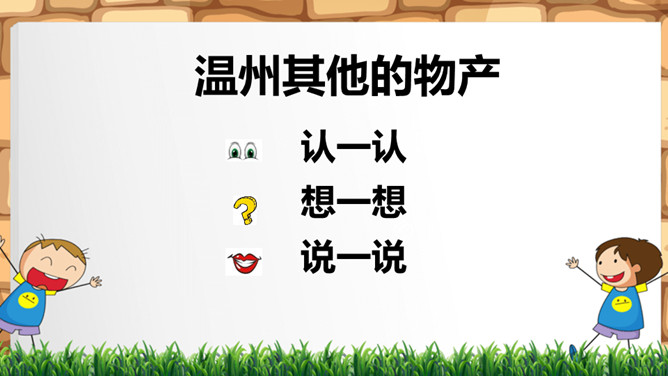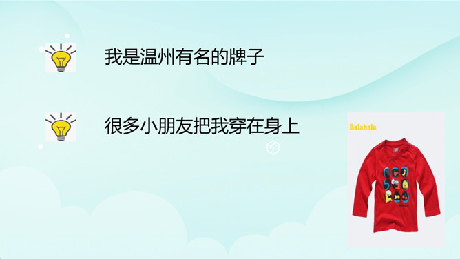 轮流讲、认真听、仔细想。我是家乡物产代言人。猜猜我是谁。我是温州有名的牌子,很多小朋友把我穿在身上。所属专题: