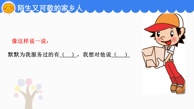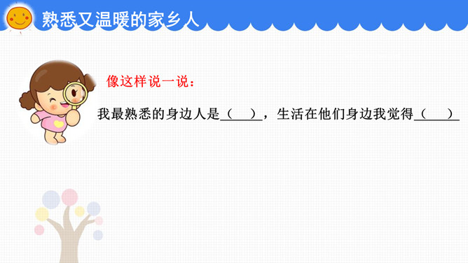 他们是谁?熟悉又温暖的家乡人。像这样说一说:我最熟悉的身边人是( ),生活在他们身边我觉得( )。陌生又可敬的家乡人。像这样说一说:默默为我服务过的有( ),我想对他说( )。这样做对吗?说一说:长大后我想做一名( ),为家乡和祖国发展贡献力量!对身边的家乡人说一声“谢谢”。搜集为家乡做过贡献的名人故事。所属专题:可亲可敬的家乡人ppt。