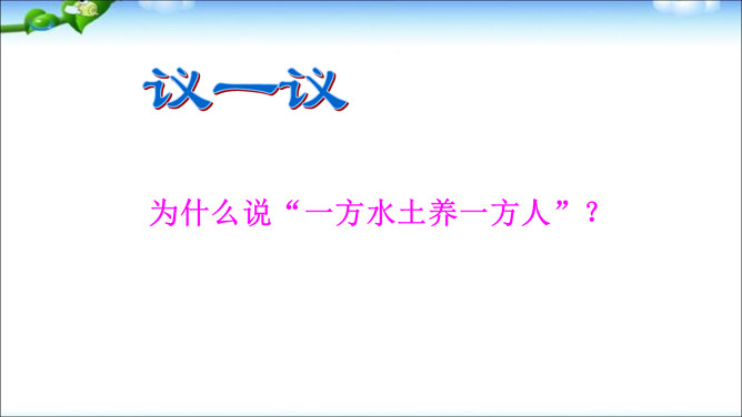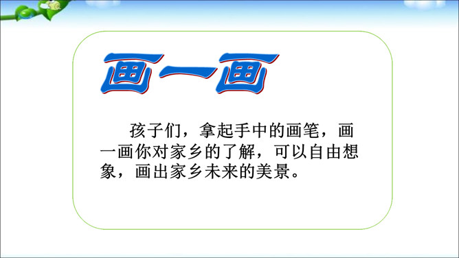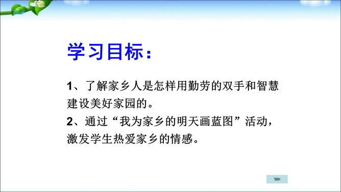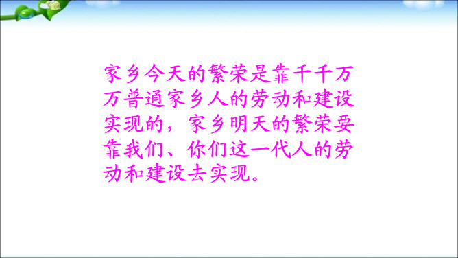 学习目标:1、了解家乡人是怎样用勤劳的双手和智慧建设美好家园的。2、通过“我为家乡的明天画蓝图”活动,激发学生热爱家乡的情感。议一议:为什么说“一方水土养一方人”?画一画:孩子们,拿起手中的画笔,画一画你对家乡的了解,可以自由想象,画出家乡未来的美景。从创意、构思、整体效果评一评!家乡今天的繁荣是靠千千万万普通家乡人的劳动和建设实现的,家乡明天的繁荣要靠我们、你们这一代人的劳动和建设去实现。所属专题:可亲可敬的家乡人ppt。