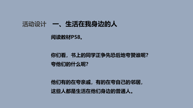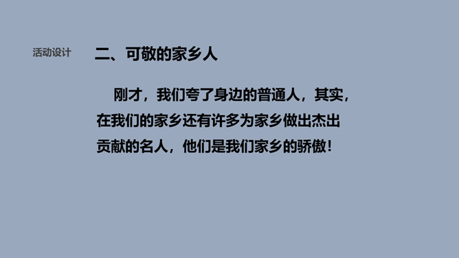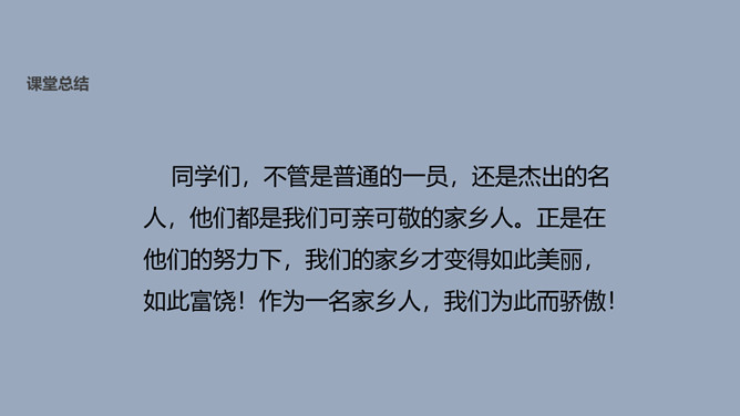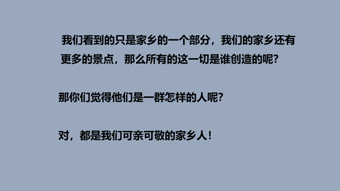 一方水土养一方人,这里不仅山清水秀,而且人杰地灵。我们看到的只是家乡的一个部分,我们的家乡还有更多的景点,那么所有的这一切是谁创造的呢?那你们觉得他们是一群怎样的人呢?对,都是我们可亲可敬的家乡人!你们看,书上的同学正争先恐后地夸赞谁呢?夸他们的什么呢?他们有的在夸亲戚,有的在夸自己的邻居,这些人都是生活在他们身边的普通人。你们身边也有这样的人吗?说说你和与家乡人的故事吧。刚才,我们夸了身边的普通人,其实,在我们的家乡还有许多为家乡做出杰出贡献的名人,他们是我们家乡的骄傲!所属专题:可亲可敬的家乡人ppt。