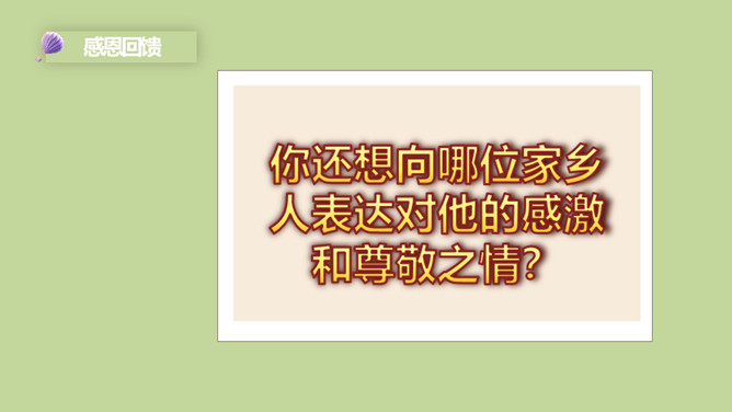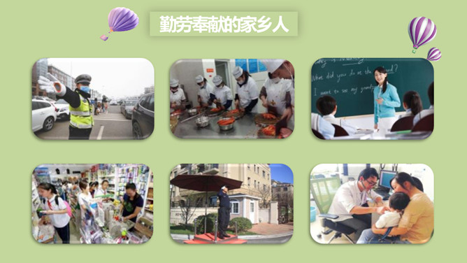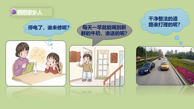 说说家乡话。分享你与家乡人的温暖故事。停电了,谁来修呢?每天一早就能喝到新鲜的牛奶,谁送的呢?干净整洁的道路谁打理的呢?食堂师傅准备了美味的饭菜。清洁工将马路打扫得干干净净。珍惜他们的劳动成果。外卖小哥迟到了一会儿……理解包容。你还想向哪位家乡人表达对他的感激和尊敬之情?所属专题:可亲可敬的家乡人ppt。