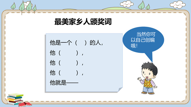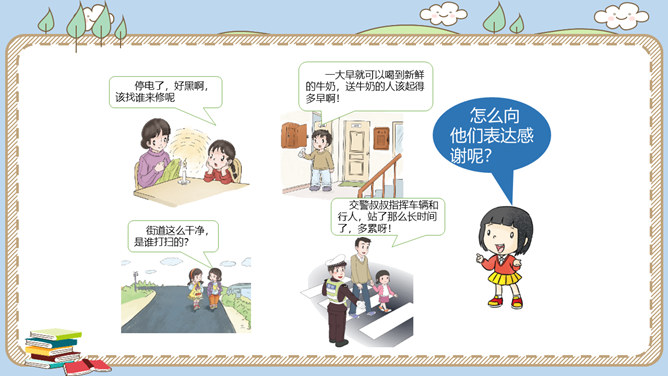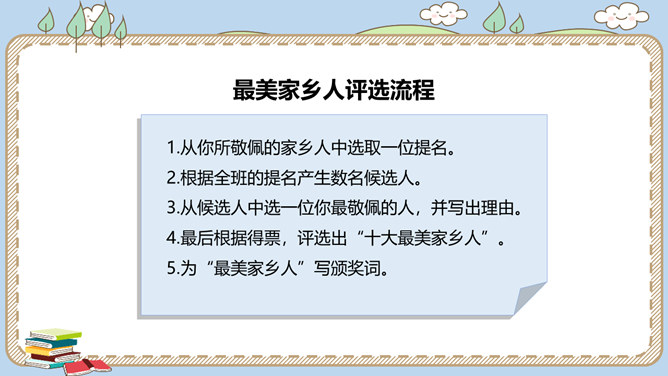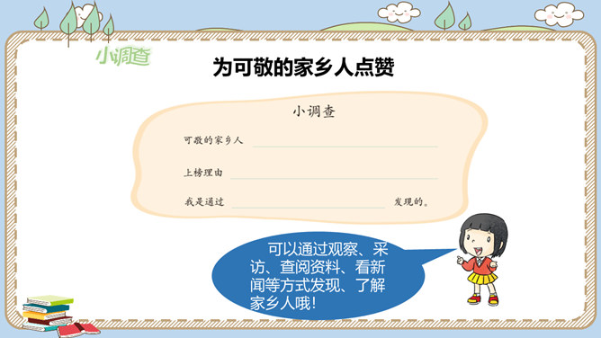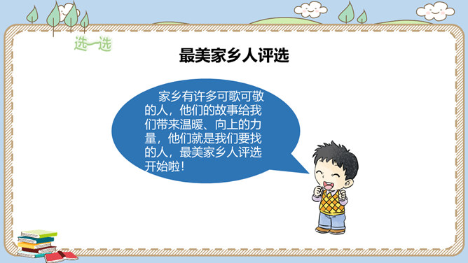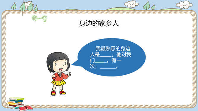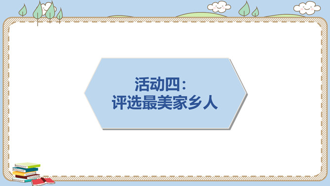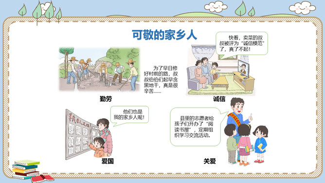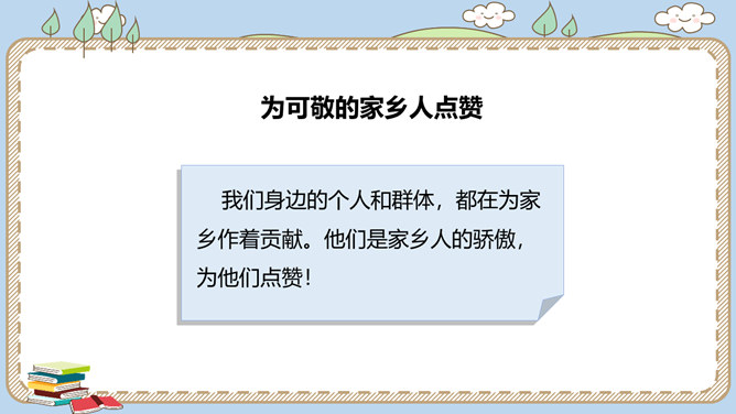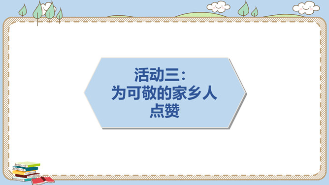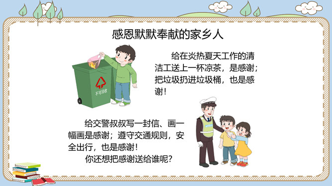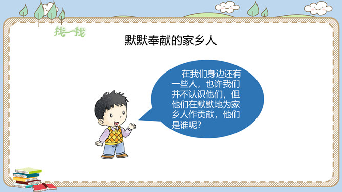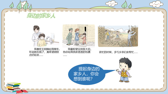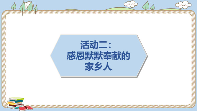 活动一:寻找身边的家乡人。提起身边的家乡人,你会想到谁呢?我喜欢王阿姨给我理发。 听说她生病了,真希望她快点好起来……我最盼望见到张大伯,他总给我捎来爸爸的包裹……农忙的时候,多亏乡亲们来帮忙……活动二:感恩默默奉献的家乡人。在我们身边还有一些人,也许我们并不认识他们,但他们在默默地为家乡人作贡献,他们是谁呢?给在炎热夏天工作的清洁工送上一杯凉茶,是感谢;把垃圾扔进垃圾桶,也是感谢!给交警叔叔写一封信、画一幅画是感谢;遵守交通规则,安全出行,也是感谢!所属专题:可亲可敬的家乡人ppt。