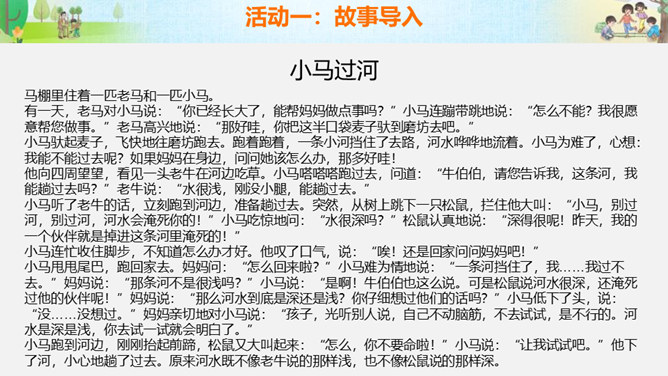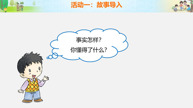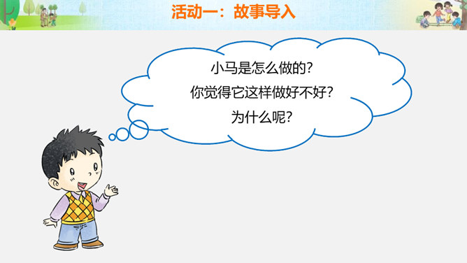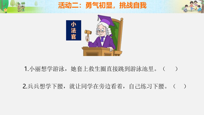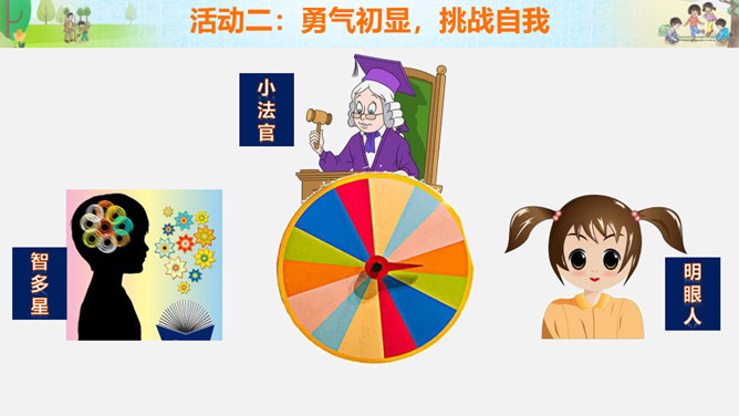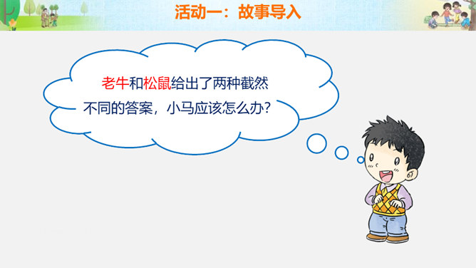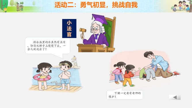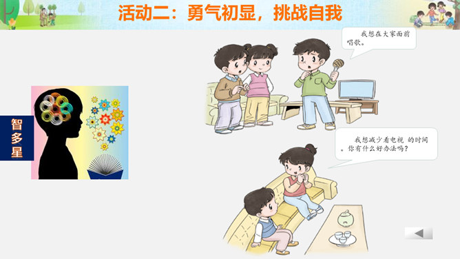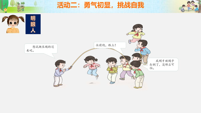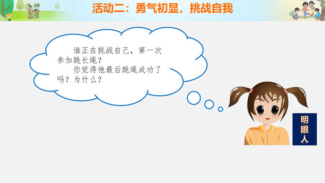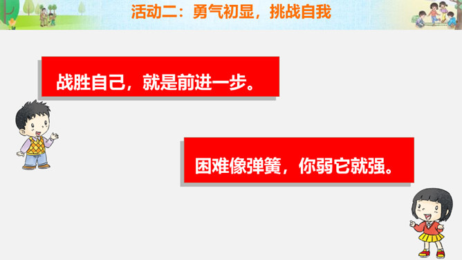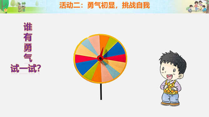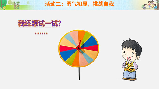 活动一:故事导入。老牛和松鼠给出了两种截然不同的答案,小马应该怎么办?小马是怎么做的?你觉得它这样做好不好?为什么呢?事实怎样?你懂得了什么?活动二:勇气初显,挑战自我。谁有勇气试一试?谁正在挑战自己,第一次参加跳长绳?你觉得他最后跳绳成功了吗?为什么?战胜自己,就是前进一步。困难像弹簧,你弱它就强。活动三:小组合作,实践挑战。(1)选择一件马上可以尝试做的事;(2)以小组为单位;(3)每个同学必须完成一个挑战任务,并且帮助至少一个同学完成挑战任务。所属专题:挑战第一次ppt。