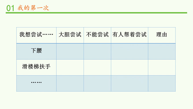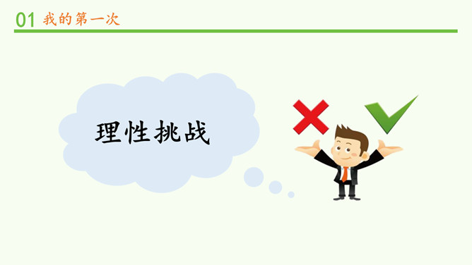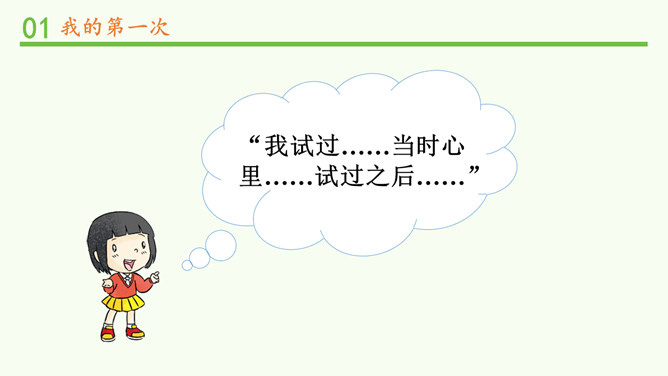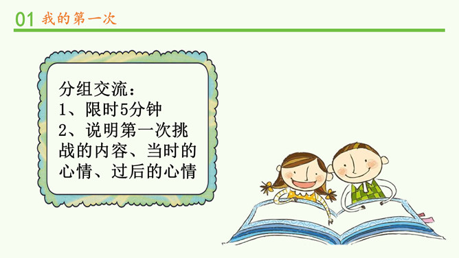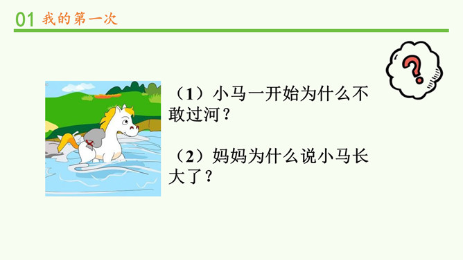 (1)小马一开始为什么不敢过河?(2)妈妈为什么说小马长大了?我会自己买东西了。我喜欢飞一样的感觉,但还是有点紧张。多玩几次就好了!哎呀,煳(hú)了!没事的。下次记得火要小点,这样就不容易煳了。“我试过……当时心里……试过之后……”分组交流:1、限时5分钟。2、说明第一次挑战的内容、当时的心情、过后的心情。挑战黑盒子。理性挑战。所属专题:挑战第一次ppt。