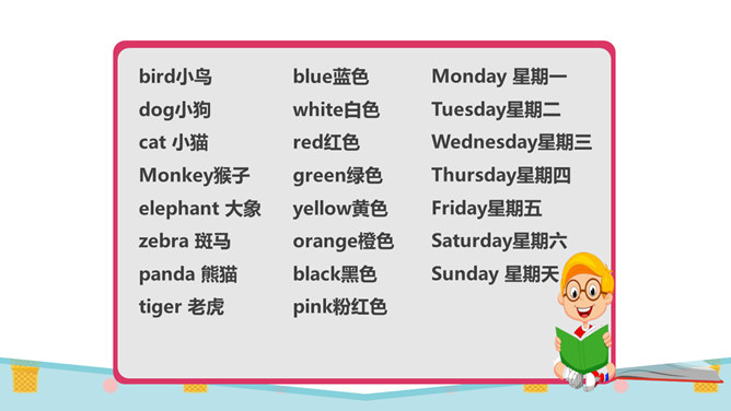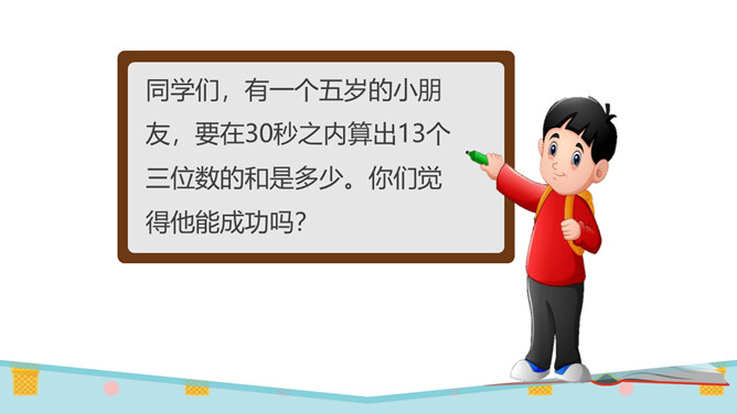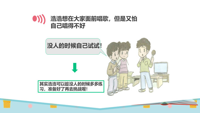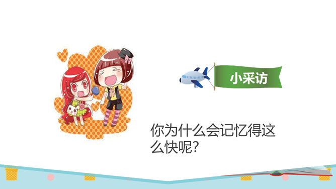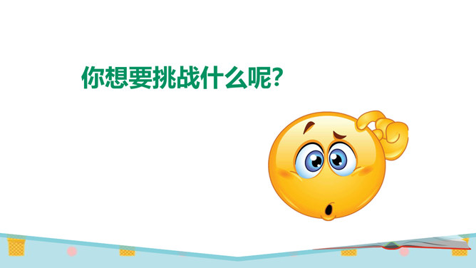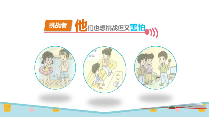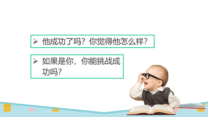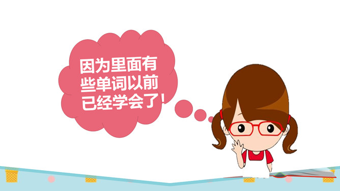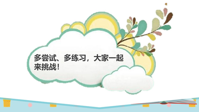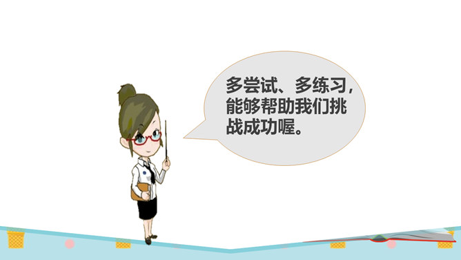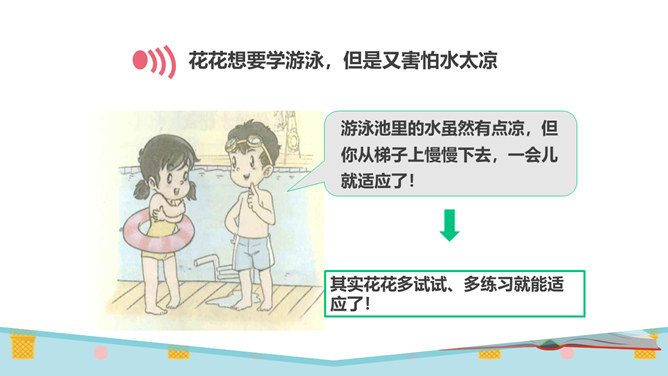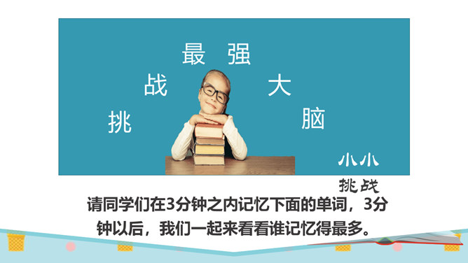 同学们,有一个五岁的小朋友,要在30秒之内算出13个三位数的和是多少。你们觉得他能成功吗?他成功了吗?你觉得他怎么样?如果是你,你能挑战成功吗?请同学们在3分钟之内记忆下面的单词,3分钟以后,我们一起来看看谁记忆得最多。你为什么会记忆得这么快呢?因为里面有些单词以前已经学会了!因为平时有时间经常会记单词,所以记得比较快!多尝试、多练习,能够帮助我们挑战成功喔。花花想要学游泳,但是又害怕水太凉。游泳池里的水虽然有点凉,但你从梯子上慢慢下去,一会儿就适应了!所属专题:挑战第一次ppt。