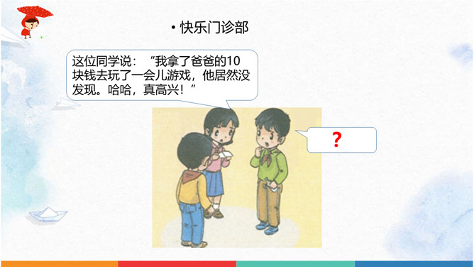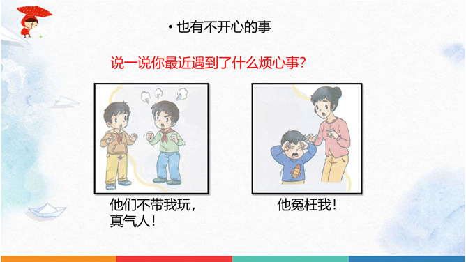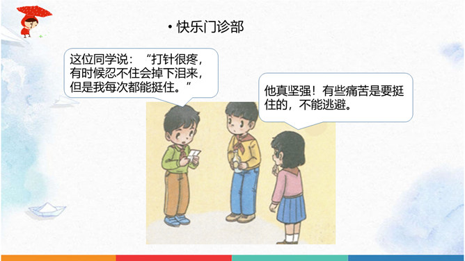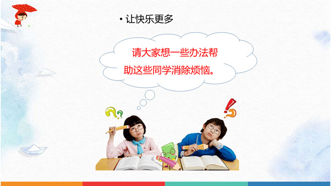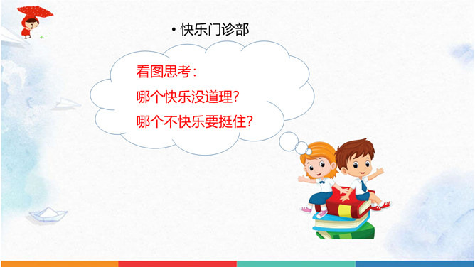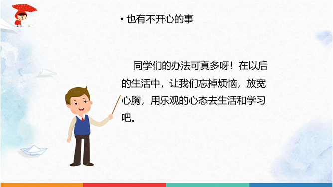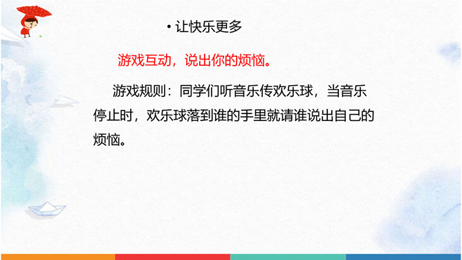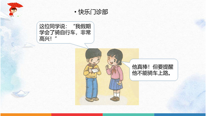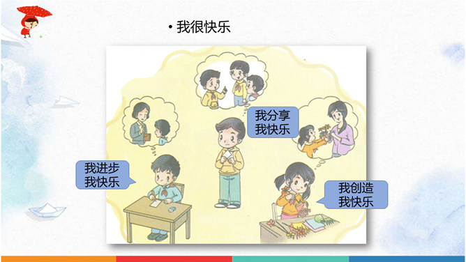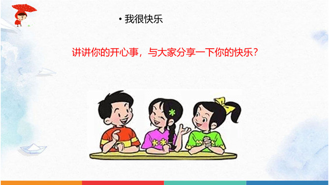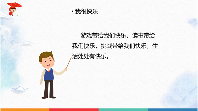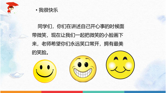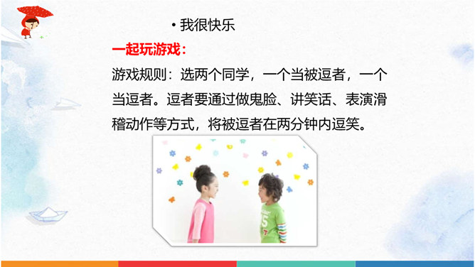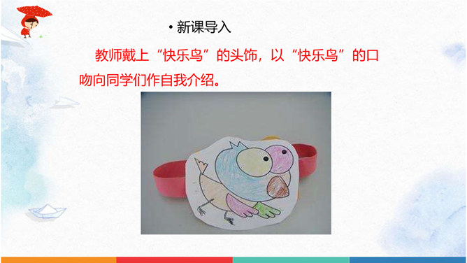 教师戴上“快乐鸟”的头饰,以“快乐鸟”的口吻向同学们作自我介绍。一起玩游戏:游戏规则:选两个同学,一个当被逗者,一个当逗者。逗者要通过做鬼脸、讲笑话、表演滑稽动作等方式,将被逗者在两分钟内逗笑。游戏带给我们快乐,读书带给我们快乐,挑战带给我们快乐,生活处处有快乐。讲讲你的开心事,与大家分享一下你的快乐?同学们,你们在讲述自己开心事的时候面带微笑,现在让我们一起把微笑的小脸画下来,老师希望你们永远笑口常开,拥有最美的笑脸。所属专题:学做快乐鸟ppt。