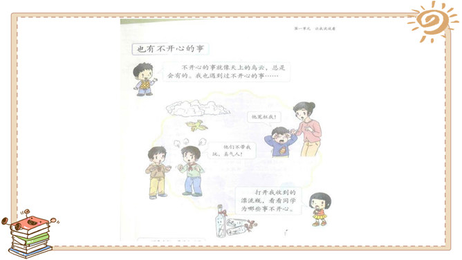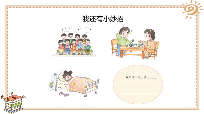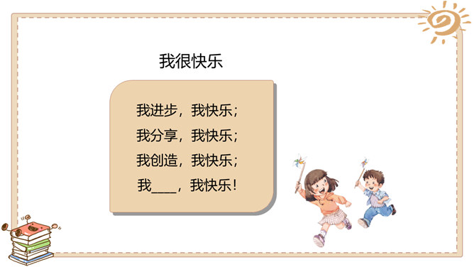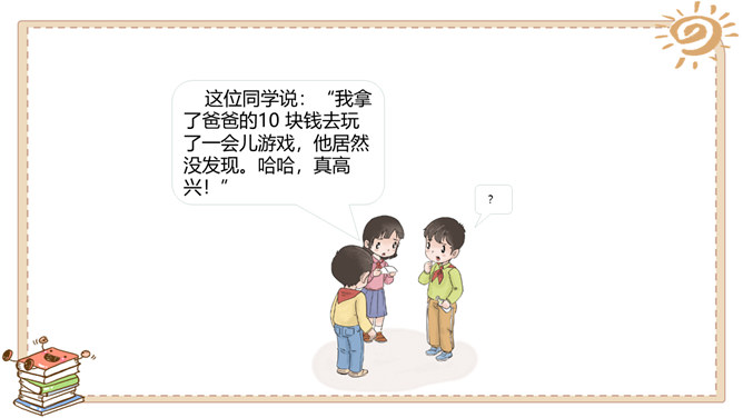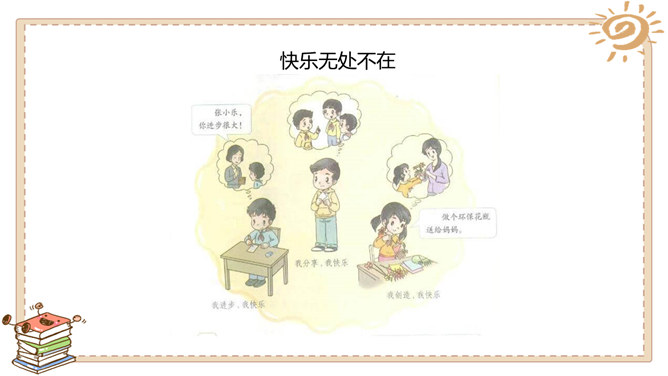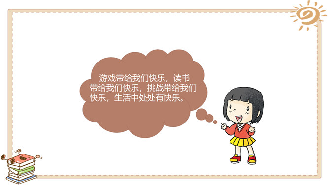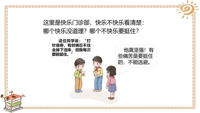 游戏带给我们快乐,读书带给我们快乐,挑战带给我们快乐,生活中处处有快乐。这里是快乐门诊部,快乐不快乐看清楚:哪个快乐没道理?哪个不快乐要挺住?这位同学说:“打针很疼,有时候忍不住会掉下泪来,但我每次都能挺住。”他真坚强!有些痛苦是要挺住的,不能逃避。这位同学说:“我假期学会了骑自行车,非常高兴!”他真棒!但 要提醒他不能骑 车上路。这位同学说:“我拿了爸爸的10 块钱去玩了一会儿游戏,他居然没发现。哈哈,真高兴!”你有什么事情想让大家帮你诊断一下吗?所属专题:学做快乐鸟ppt。