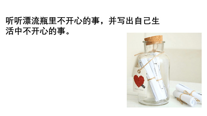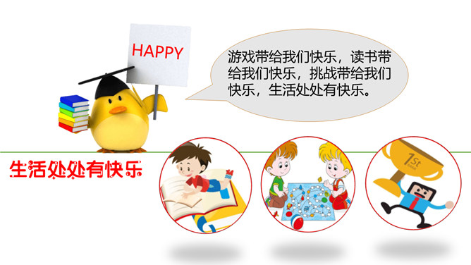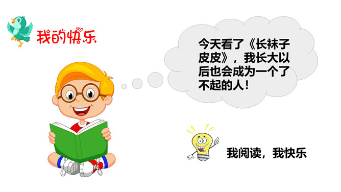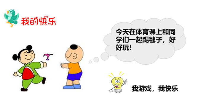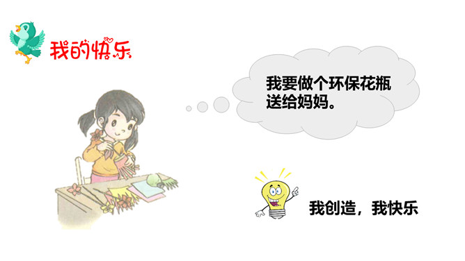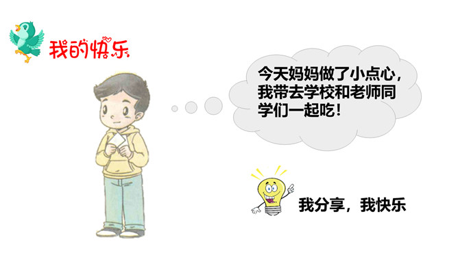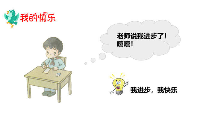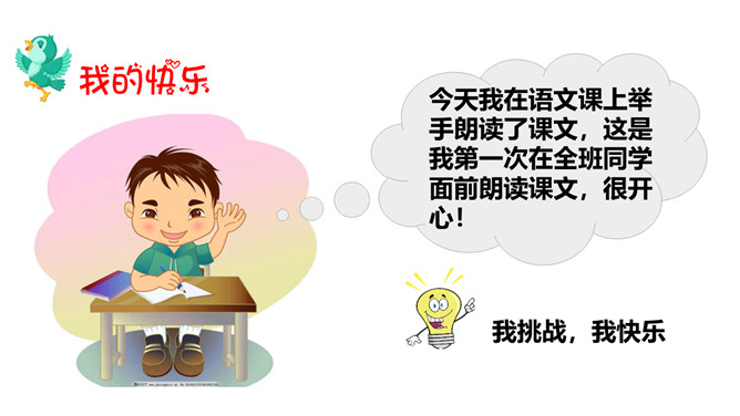 听完这首歌,你的心情怎么样呢?看表情,说感受,并模仿。老师说我进步了!嘻嘻!我进步,我快乐。今天妈妈做了小点心,我带去学校和老师同学们一起吃!我分享,我快乐。我要做个环保花瓶送给妈妈。我创造,我快乐。今天看了《长袜子皮皮》,我长大以后也会成为一个了不起的人!我阅读,我快乐。今天我在语文课上举手朗读了课文,这是我第一次在全班同学面前朗读课文,很开心!我挑战,我快乐。今天在体育课上和同学们一起踢毽子,好好玩!我游戏,我快乐。小组交流:分享生活中快乐的事情!所属专题:学做快乐鸟ppt。