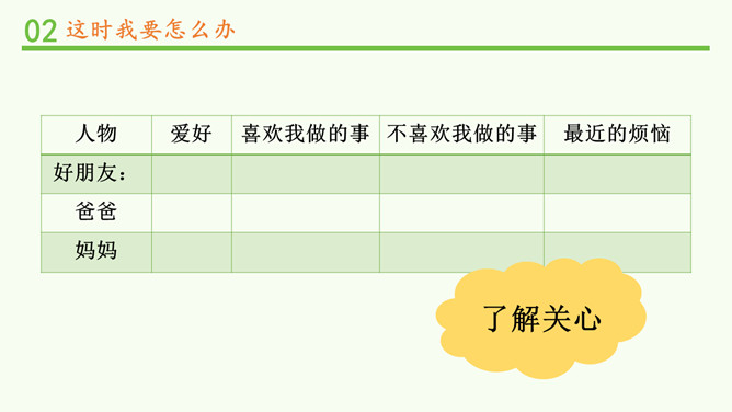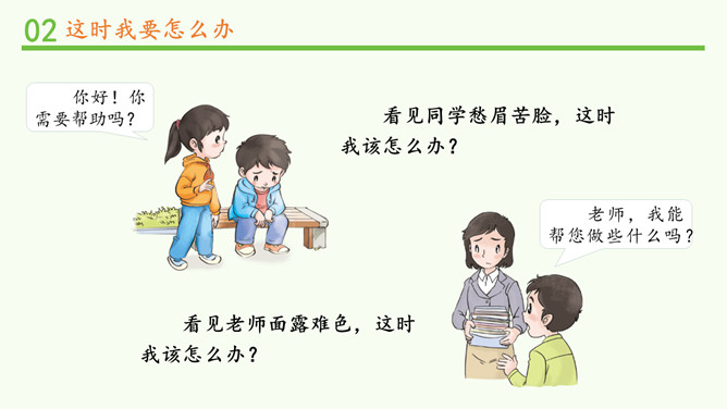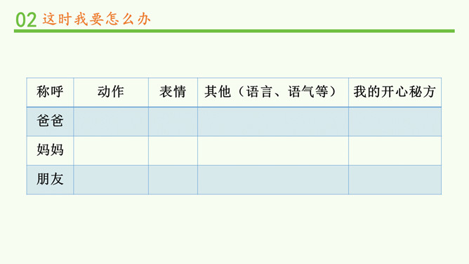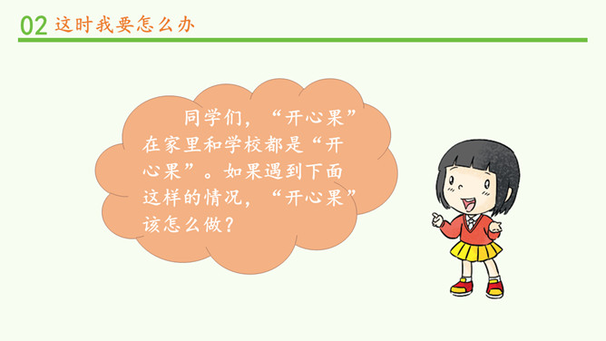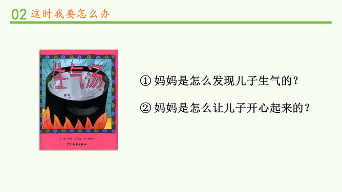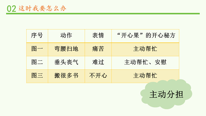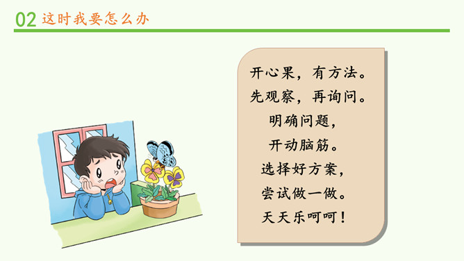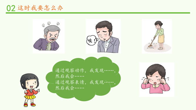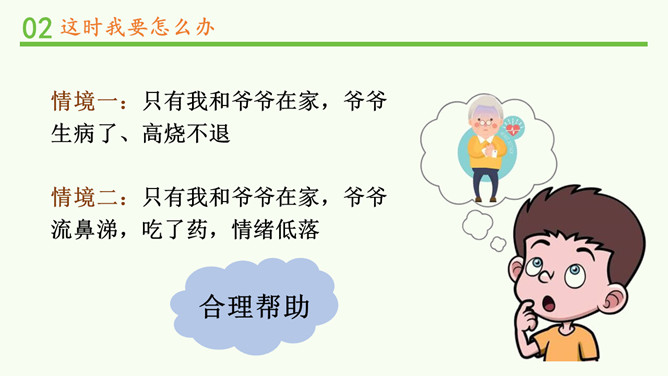① 妈妈是怎么发现儿子生气的?② 妈妈是怎么让儿子开心起来的?同学们,“开心果”在家里和学校都是“开心果”。如果遇到下面这样的情况,“开心果”该怎么做?你好!你需要帮助吗?看见同学愁眉苦脸,这时我该怎么办?看见老师面露难色,这时我该怎么办?老师,我能帮您做些什么吗?通过观察动作,我发现……,然后我会……通过观察表情,我发现……,然后我会……情境一:只有我和爷爷在家,爷爷生病了、高烧不退。情境二:只有我和爷爷在家,爷爷流鼻涕,吃了药,情绪低落。所属专题:做个开心果ppt。