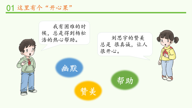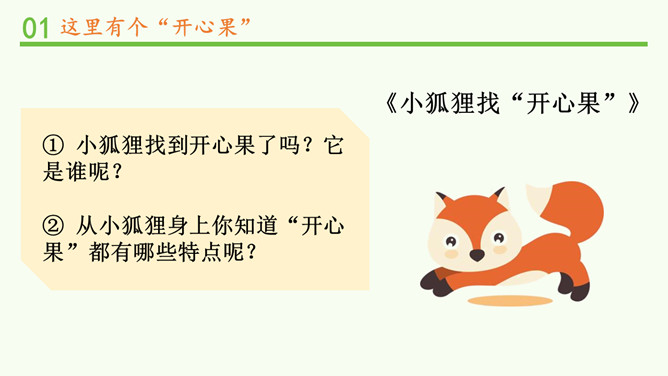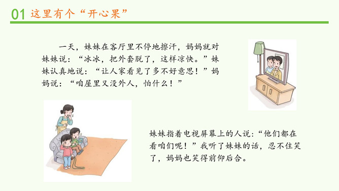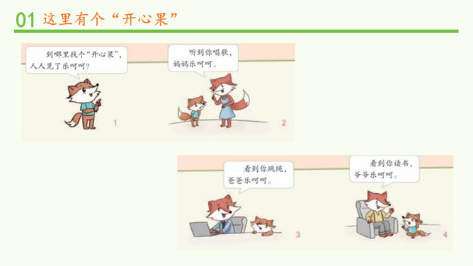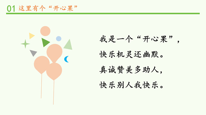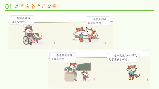 ① 小狐狸找到开心果了吗?它是谁呢?② 从小狐狸身上你知道“开心果”都有哪些特点呢?一天,妹妹在客厅里不停地擦汗,妈妈就对妹妹说:“冰冰,把外套脱了,这样凉快。”妹妹认真地说:“让人家看见了多不好意思!”妈妈说:“咱屋里又没外人,怕什么!”妹妹指着电视屏幕上的人说:“他们都在看咱们呢!”我听了妹妹的话,忍不住笑了,妈妈也笑得前仰后合。我有困难的时候,总是得到杨松浩的热心帮助。刘思宇的赞美总是 很真诚,让人很开心。我是一个“开心果”,快乐机灵还幽默。所属专题:做个开心果ppt。
