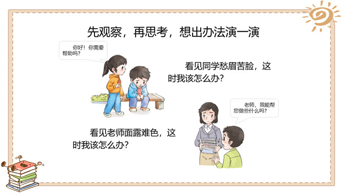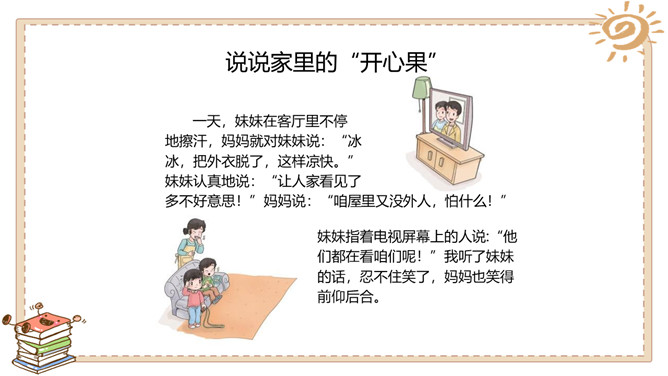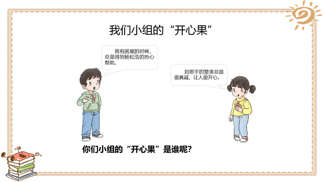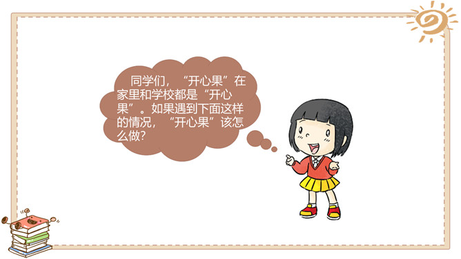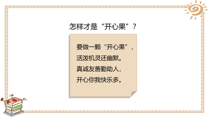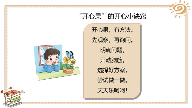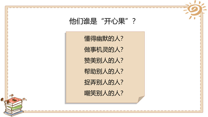 活动一:这里有个“开心果”。我不仅要让自己成为“快乐鸟”,还希望给身边的人带来快乐,成为大家的“开心果”。他们谁是“开心果”?懂得幽默的人?做事机灵的人?赞美别人的人?帮助别人的人?捉弄别人的人?嘲笑别人的人?怎样才是“开心果”?要做一颗“开心果”,活泼机灵还幽默。真诚友善勤助人,开心你我快乐多。活动二:这时我要怎么办。同学们,“开心果”在家里和学校都是“开心果”。如果遇到下面这样的情况,“开心果”该怎么做?开心果,有方法。先观察,再询问。明确问题,开动脑筋。所属专题:做个开心果ppt。