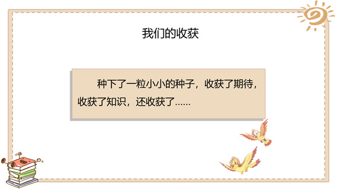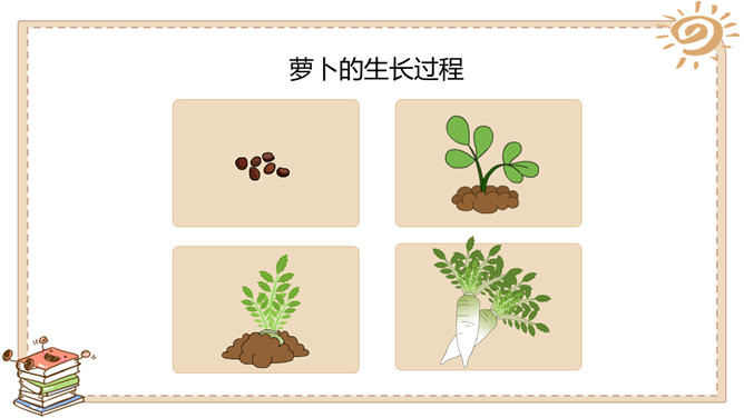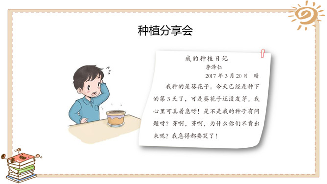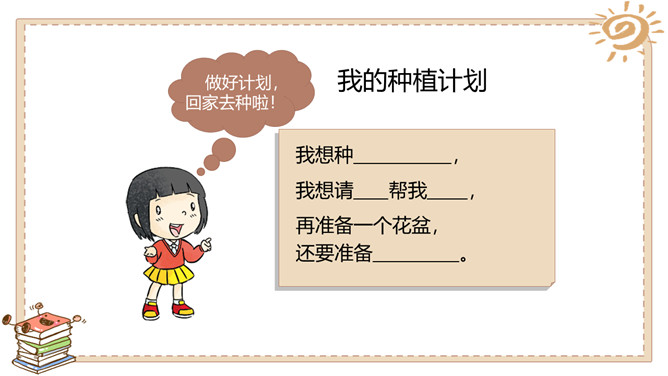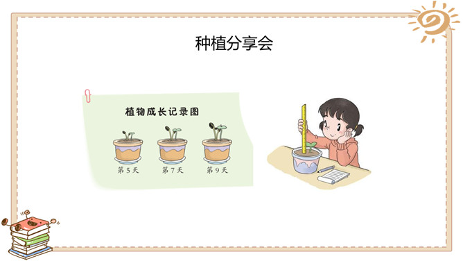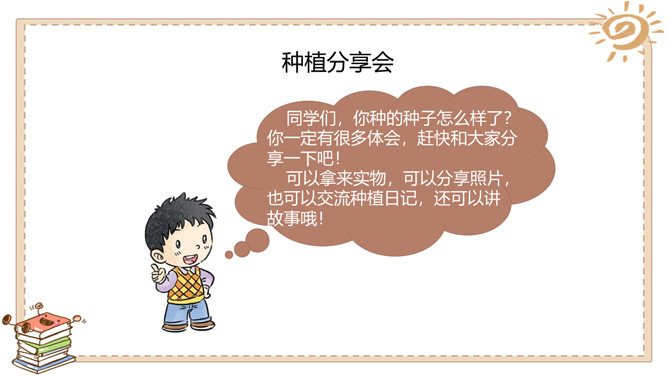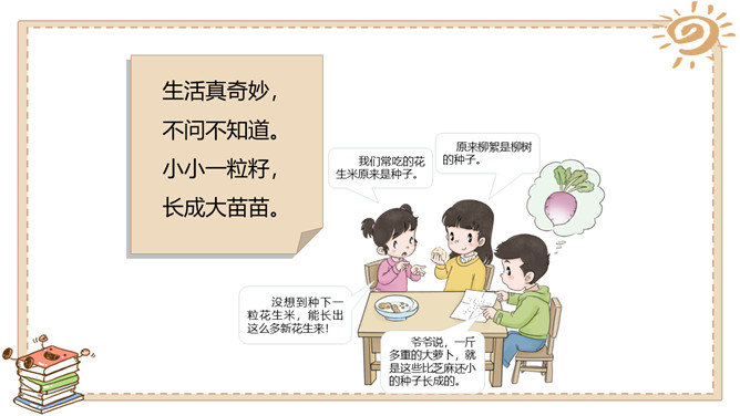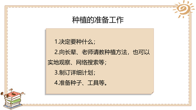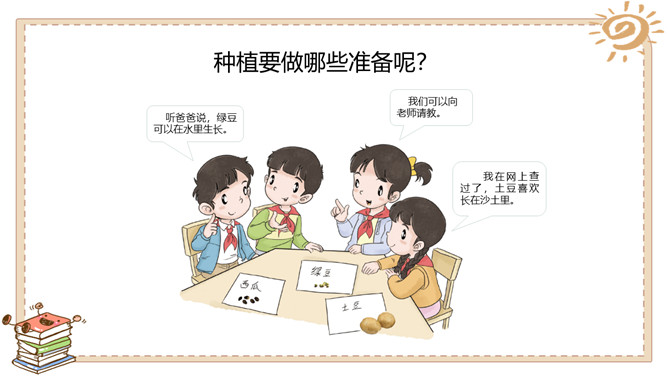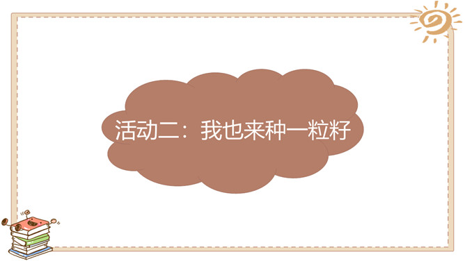 活动一:奇妙的生命。春天是万物生长的季节。如果种下一粒种子,会发生什么事情呢?原来柳絮是柳树的种子。我们常吃的花生米原来是种子。没想到种下一粒花生米,能长出这么多新花生来!爷爷说,一斤 多重的大萝卜,就 是这些比芝麻还小 的种子长成的。活动二:我也来种一粒籽。种植要做哪些准备呢?听爸爸说,绿豆可以在水里生长。我们可以向老师请教。我在网上查 过了,土豆喜欢 长在沙土里。种植的准备工作:1.决定要种什么;2.向长辈、老师请教种植方法,也可以实地观察、网络搜索等;3.制订详细计划;4.准备种子、工具等。所属专题:试种一粒籽ppt。