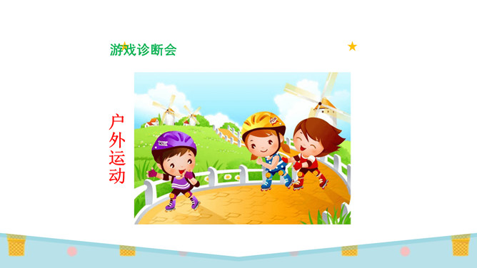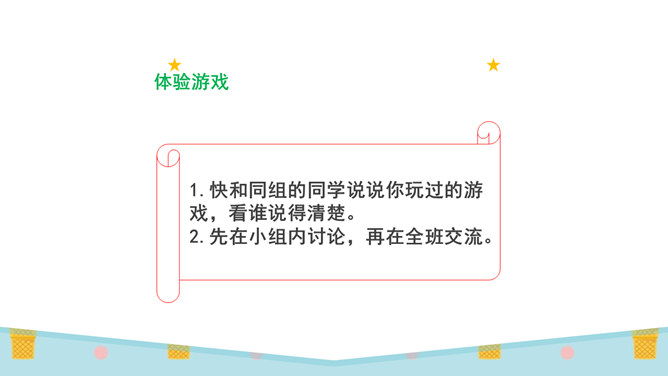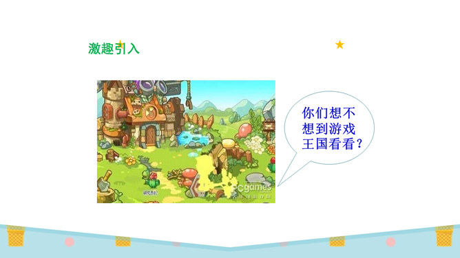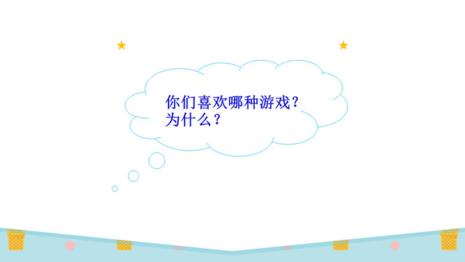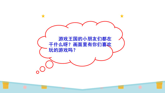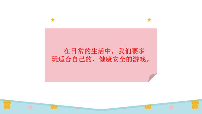 你们想不想到游戏王国看看?游戏王国的小朋友们都在干什么呀?画面里有你们喜欢玩的游戏吗?1.快和同组的同学说说你玩过的游戏,看谁说得清楚。2.先在小组内讨论,再在全班交流。你们喜欢哪种游戏?为什么?在日常的生活中,我们要多玩适合自己的、健康安全的游戏。图片中的同学们说了些什么?你们从中明白了什么?认真观察图片,说一说你们有什么发现。同样的游戏,不同的玩伴,不同的环境,玩的感觉不一样!通过本节课的学习,我们了解到我们经常玩的游戏哪些是健康的,哪些是不健康的。所属专题:健康游戏我常玩ppt。