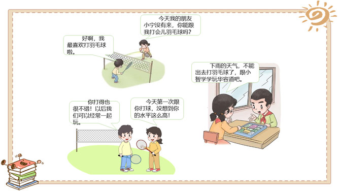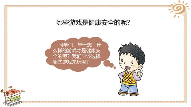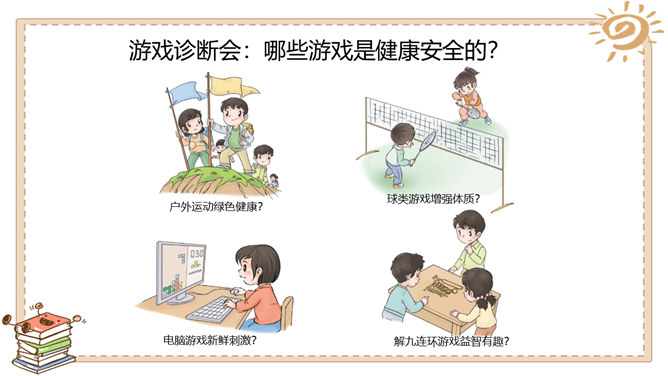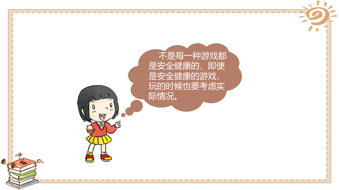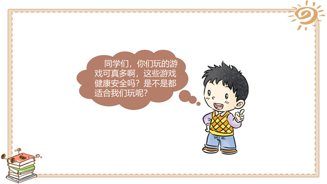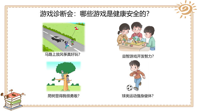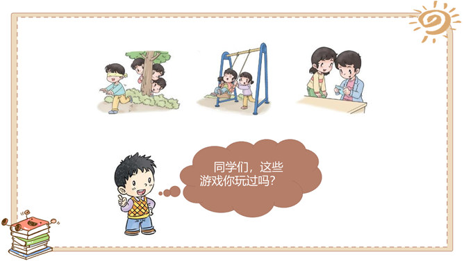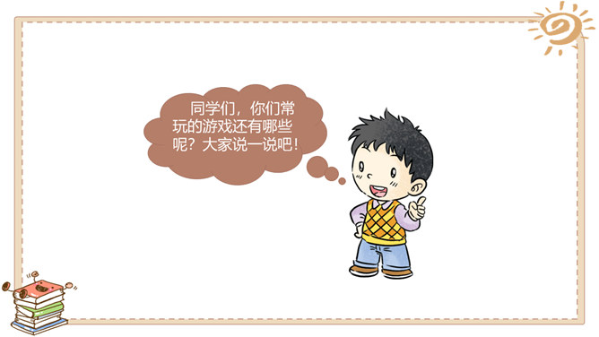 同学们,不同的天气,不同的情况,我们可以选择玩不同的游戏,每种游戏都有不同的快乐。同样的游戏,不同的伙伴,不同的环境,玩的感觉也不一样呢!这些游戏你玩过吗?同学们,你们常玩的游戏还有哪些呢?大家说一说吧!你们玩的游戏可真多啊,这些游戏健康安全吗?是不是都适合我们玩呢?想一想:什么样的游戏才是健康安全的呢?我们应该选择哪些游戏来玩呢?即使是安全健康的游戏,玩的时候也要考虑实际情况。所属专题:健康游戏我常玩ppt。