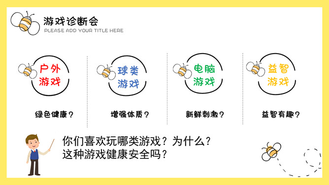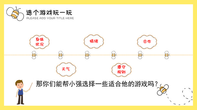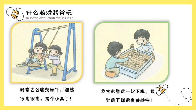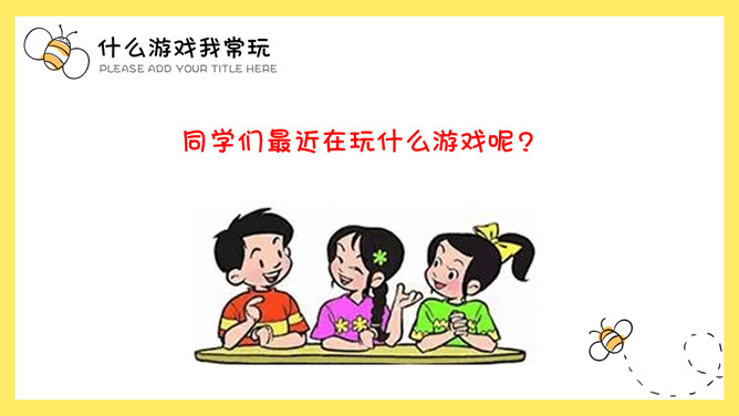 请你听见“拍拍手”的时候拍一拍手,听见“跺跺脚”的时候跺跺脚,听见“拍拍肩”的时候拍一拍自己的肩膀。看谁做得最准确!玩了这个游戏以后,你感觉怎么样?我常玩手机游戏。我常和小朋友们捉迷藏。我常去公园荡秋千,能荡很高很高,是个小高手!我常和智远一起下棋。我觉得下棋很有挑战性!同学们最近在玩什么游戏呢?你们喜欢玩哪类游戏?为什么?这种游戏健康安全吗?你们能帮小强选择一些适合他的游戏吗?所属专题:健康游戏我常玩ppt。