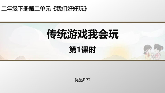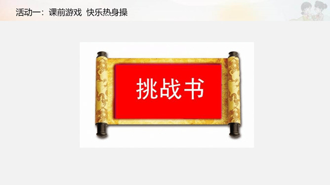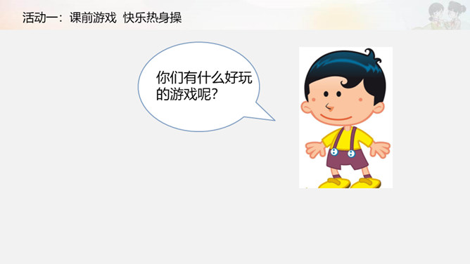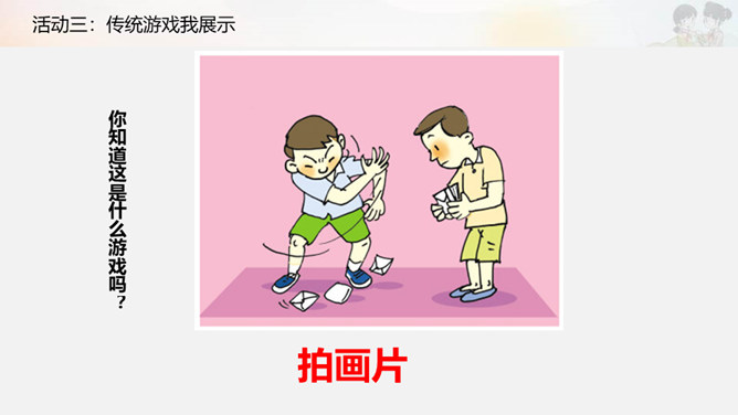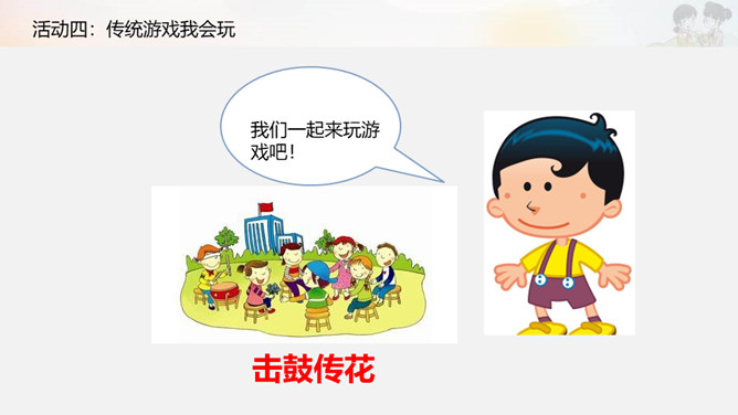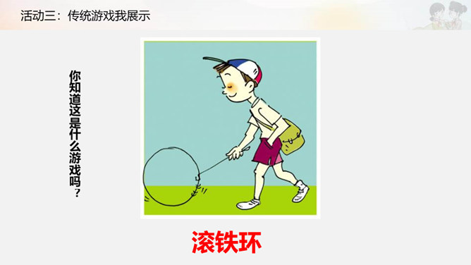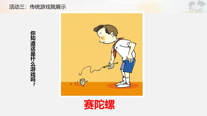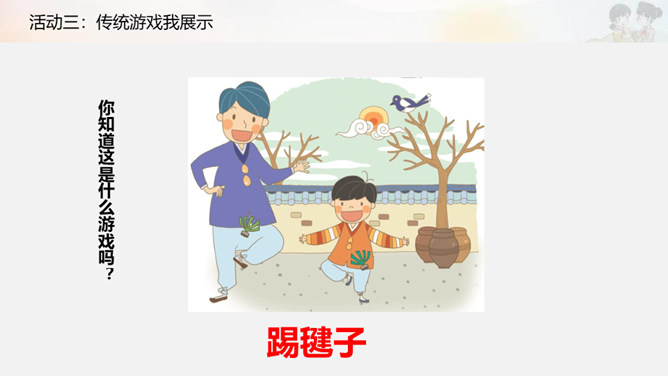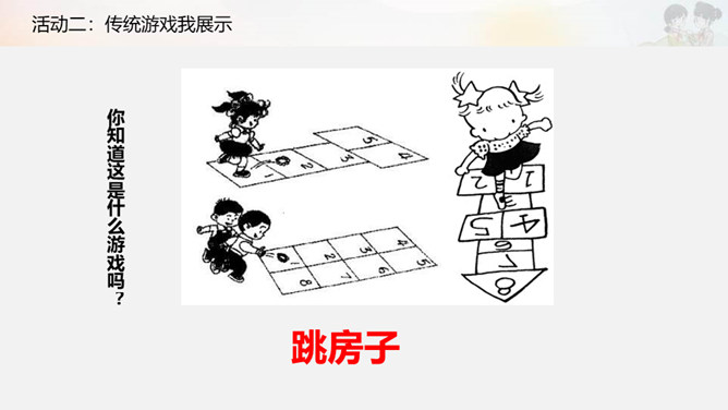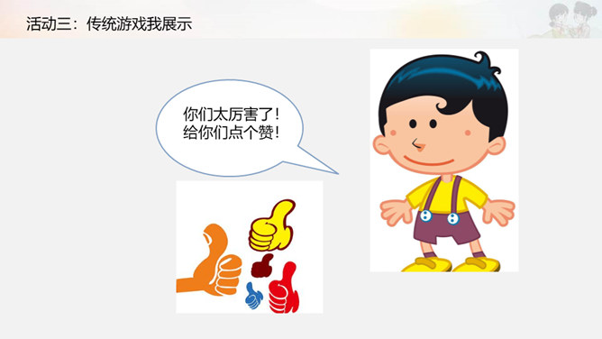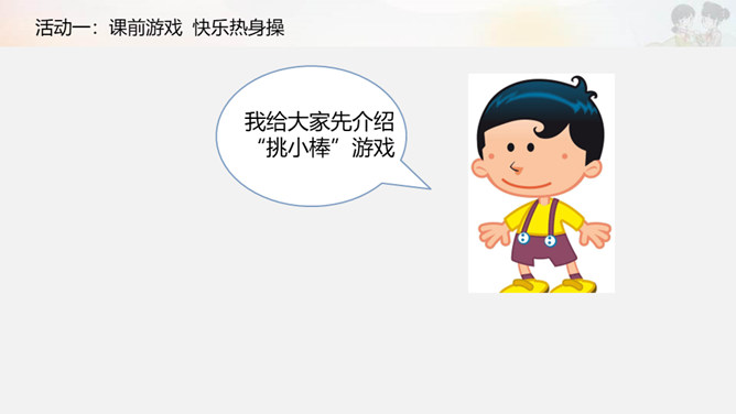 活动一:课前游戏 快乐热身操。大家好!我是壮壮。我给大家先介绍“挑小棒”游戏。你们有什么好玩的游戏呢?活动二:传统游戏我展示。你知道这是什么游戏吗?活动三:传统游戏我展示。你们太厉害了!给你们点个赞!活动四:传统游戏我会玩。我们一起来玩游戏吧!所属专题:传统游戏我会玩ppt。