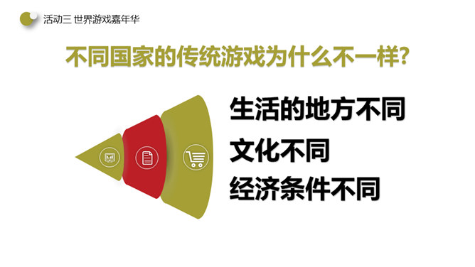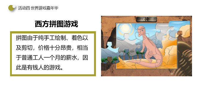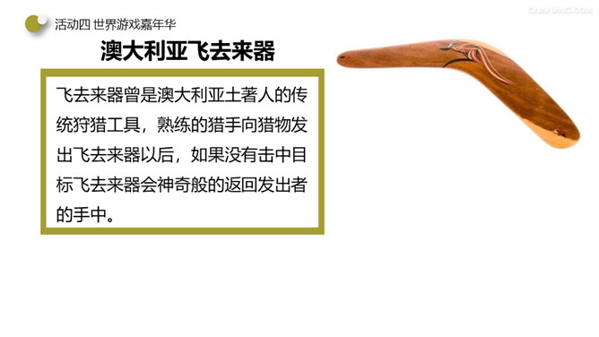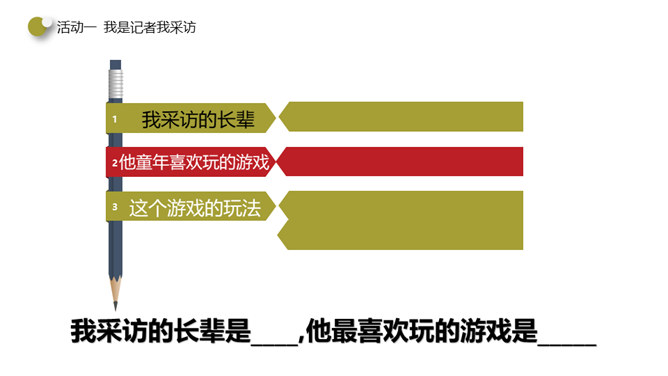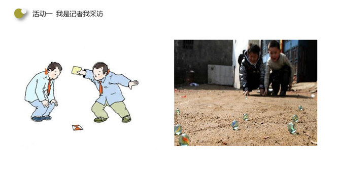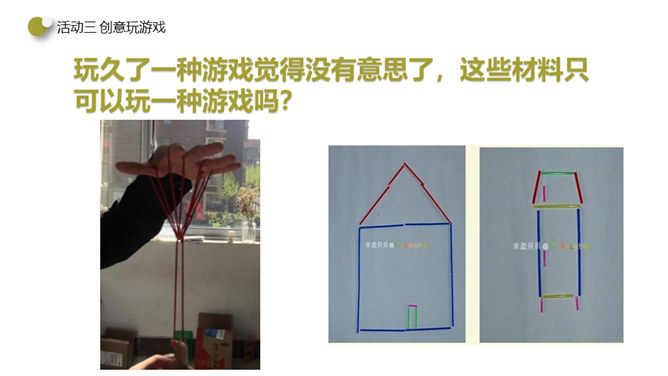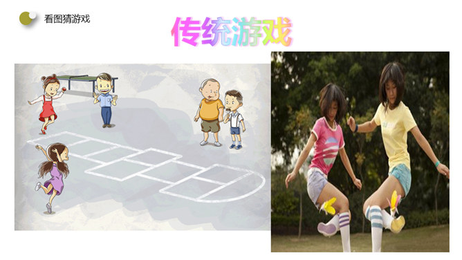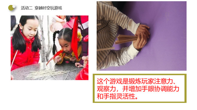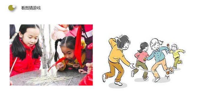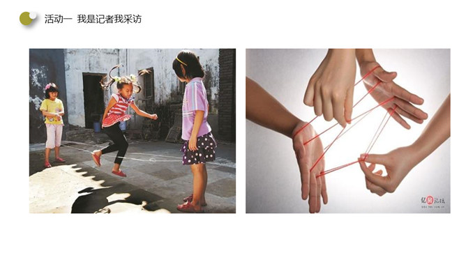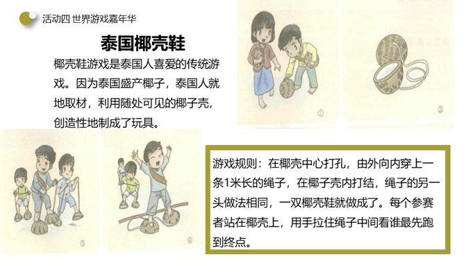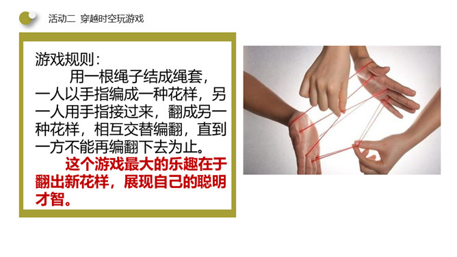 听一首歌曲,看看古代的小朋友放学后在干什么?我采访的长辈是____,他最喜欢玩的游戏是_____。游戏规则:用一根绳子结成绳套,一人以手指编成一种花样,另一人用手指接过来,翻成另一种花样,相互交替编翻,直到一方不能再编翻下去为止。这个游戏最大的乐趣在于翻出新花样,展现自己的聪明才智。这个游戏是锻炼玩家注意力、 观察力,并增加手眼协调能力和手指灵活性。玩久了一种游戏觉得没有意思了,这些材料只可以玩一种游戏吗?椰壳鞋游戏是泰国人喜爱的传统游戏。所属专题:传统游戏我会玩ppt。