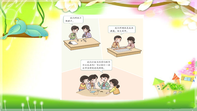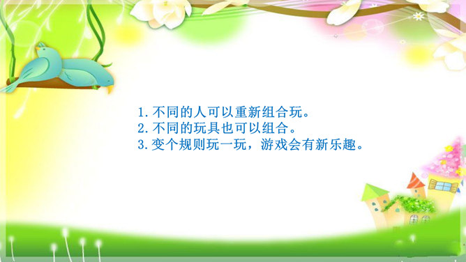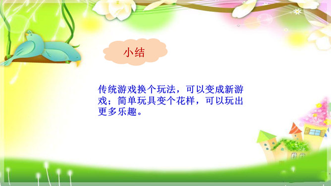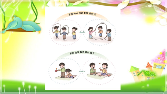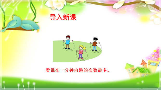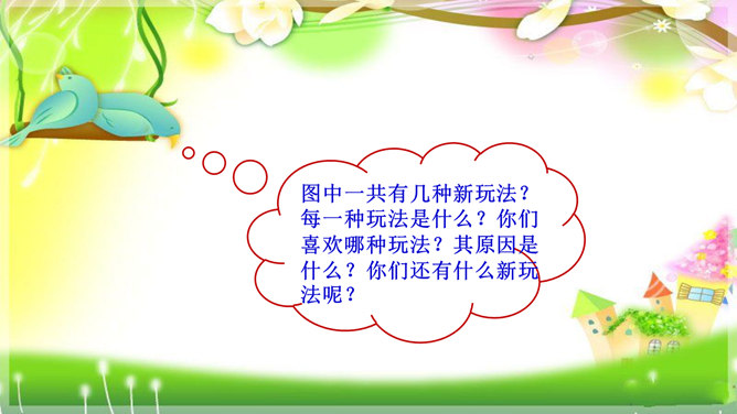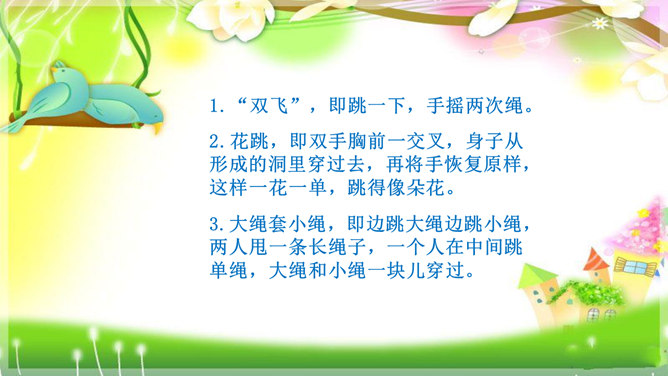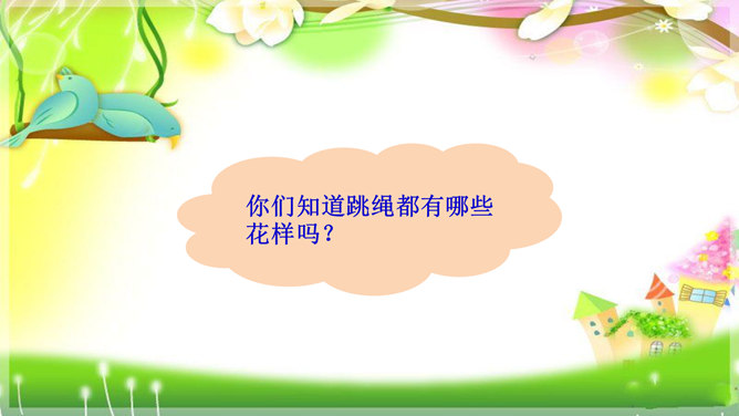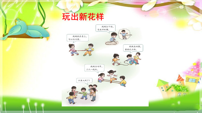谁在一分钟内跳的次数最多。你们知道跳绳都有哪些花样吗?1.“双飞”,即跳一下,手摇两次绳。2.花跳,即双手胸前一交叉,身子从形成的洞里穿过去,再将手恢复原样,这样一花一单,跳得像朵花。3.大绳套小绳,即边跳大绳边跳小绳,两人甩一条长绳子,一个人在中间跳单绳,大绳和小绳一块儿穿过。一个玩具不止一种玩法,只要同学们多多转动自己的小脑袋,大胆地想象,一定可以玩出新奇,玩出乐趣。图中一共有几种新玩法?每一种玩法是什么?你们喜欢哪种玩法?其原因是什么?你们还有什么新玩法呢?所属专题:我们有新玩法ppt。