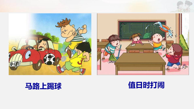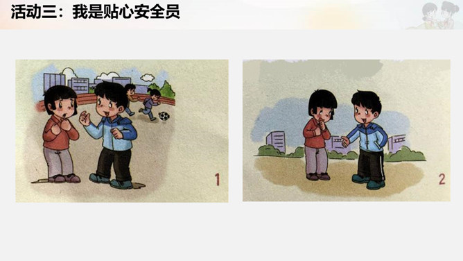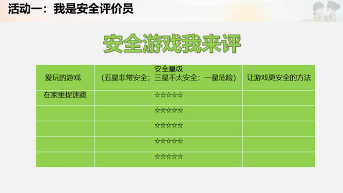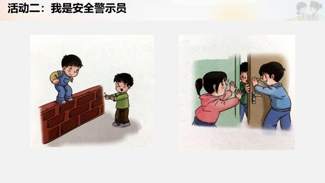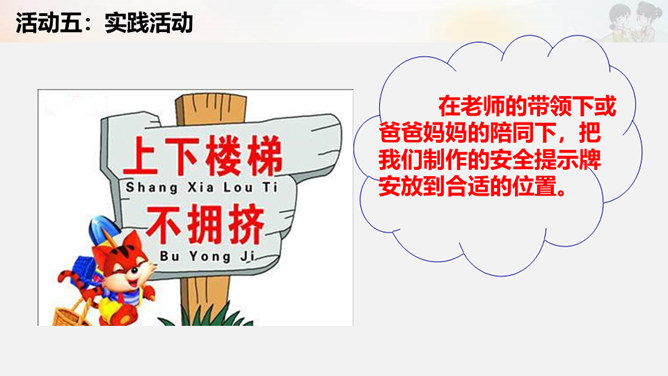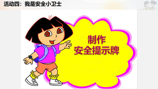 活动一:我是安全评价员。活动二:我是安全警示员。活动三:我是贴心安全员。活动四:我是安全小卫士。制作安全提示牌。活动五:实践活动。在老师的带领下或爸爸妈妈的陪同下,把我们制作的安全提示牌安放到合适的位置。所属专题:安全地玩ppt。